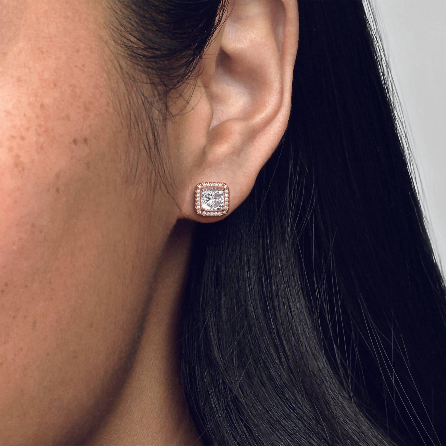 Classic earrings that will take you from season to season. Elevate your jewelry collection with the Women's Square Sparkle Halo Stud Earrings by Pandora. These earrings feature a striking square stone framed by smaller cubic zirconia, creating a captivating sparkle in every light. Made with Pandora Rose, a unique metal blend plated with 14k rose gold, these studs exude a warm elegance. The butterfly backs are crafted from 14k rose gold-plated sterling silver, ensuring a secure and stylish fit.