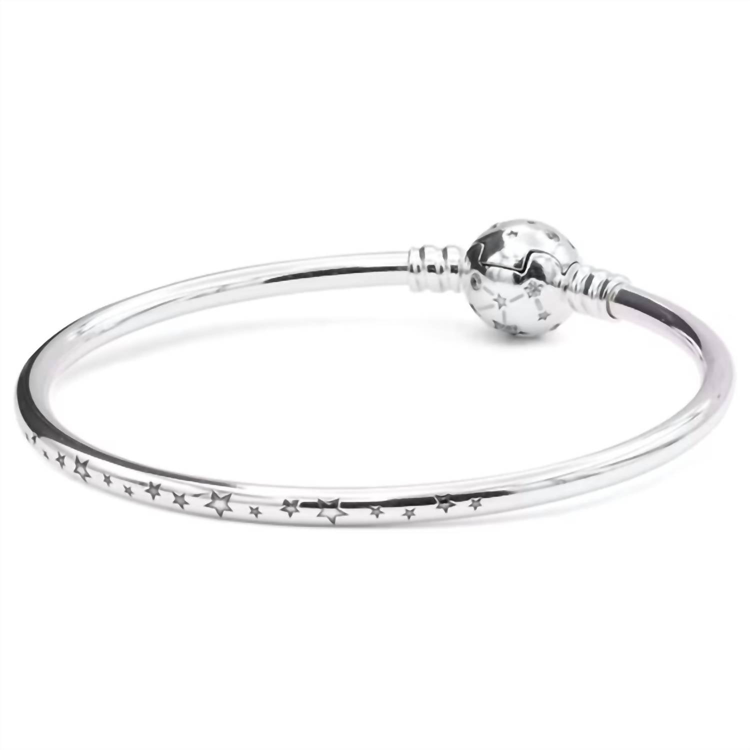 Stacked or solo - you can't go wrong with this bracelet. Introducing the Women's Stars & Galaxy Bracelet by Pandora, a celestial-inspired accessory that combines elegance with a touch of enchantment. Crafted with a sterling silver plating, this bracelet features a ball-shaped clasp adorned with engraved stars and shimmering clear cubic zirconia stones. Wear it alone or pair it with up to 16-18 Pandora Moments charms for a personalized touch. Perfect for layering with other celestial-inspired pieces for a truly stellar look.