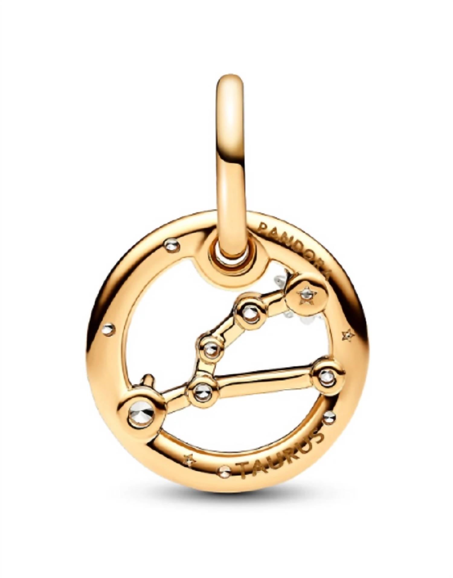 This bracelet will be your favorite go-to piece of the season. Explore celestial style with the Women's Taurus Zodiac Dangle Charm by Pandora, beautifully crafted from 14k gold-plated metal. This unique charm features a circular frame adorned with clear sparkling cubic zirconia and showcases the shape of the Taurus zodiac sign. Ideal for adding a personal touch to your Pandora bracelet, the back is engraved with "Taurus," making it a meaningful gift or a personal emblem of strength. Perfect for the loyal and strong-minded Taurus, this charm embodies down-to-earth elegance.