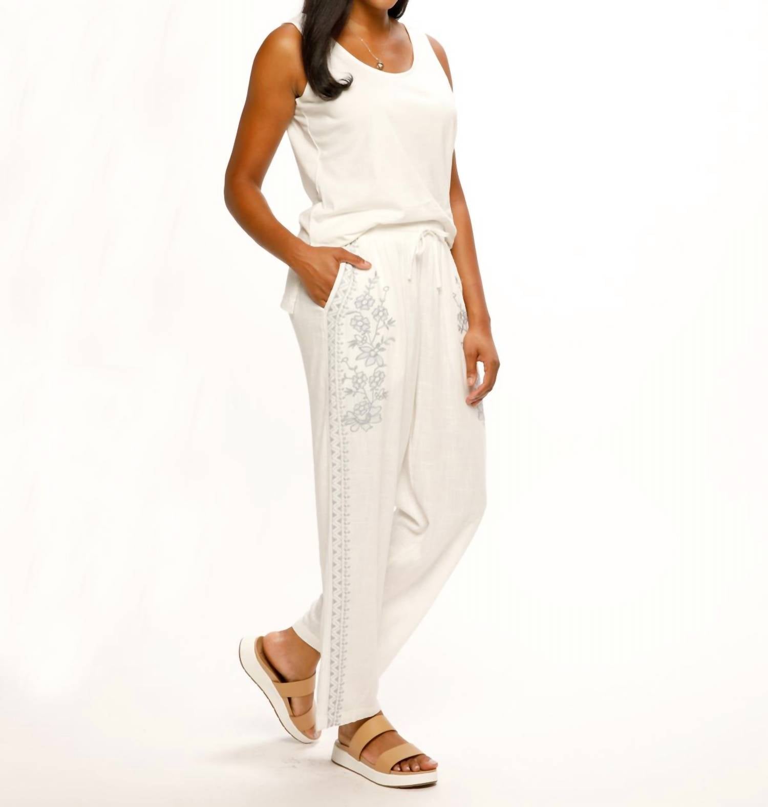 Elevate your holiday party look with the Paparazzi Linen Blend Wide Leg Embroidered Pant in chic white. With its relaxed fit, this high-rise pant boasts a viscose and linen blend, offering a lightweight and breathable option for fall occasions. It features a pull-on closure enhanced by an elastic waist with a drawstring, and practical inseam pockets. Care is a breeze—simply machine wash cold on a gentle cycle and tumble dry low.
