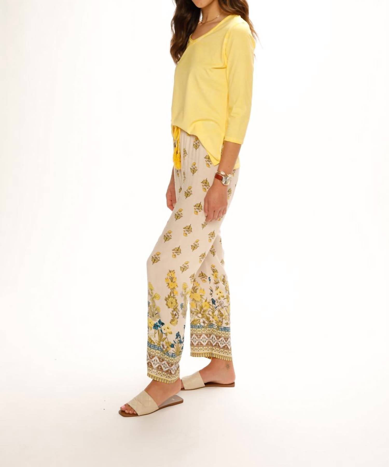 Step into casual elegance with the Printed Pull-on Wide Leg Pant by PAPARAZZI, crafted in a vibrant yellow floral pattern that captures the essence of spring. These women's pants feature a relaxed fit with a high-rise waist, enhanced by an elastic and drawstring tie closure adorned with tassels for a custom fit. Made from 100% Viscose, these vintage-inspired pants boast a 30" inseam and wide-leg design perfect for travel occasions. Easy to care for, simply machine wash on a gentle cycle and tumble dry low to keep them looking fresh.