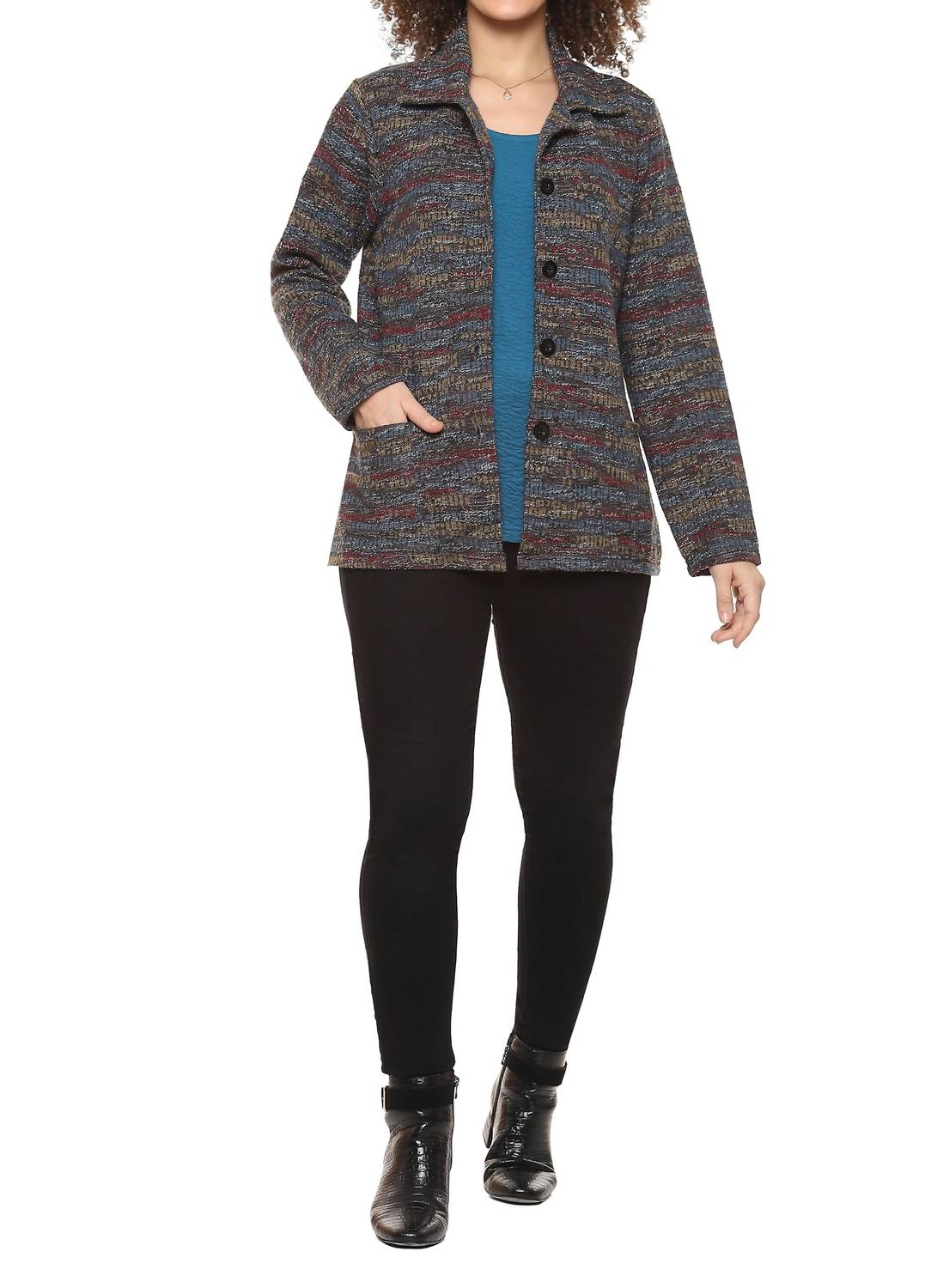 The Megan Jacket by Parsley & Sage is a stylish addition to any dinner party ensemble with a minimalist patterned design. This women’s casual jacket in grey features long sleeves and a classic collar, making it perfect for spring evenings or Thanksgiving gatherings. While it has a button closure, the jacket does not include pockets, ensuring a sleek silhouette. For care, hand wash and line dry this elegant piece crafted without lining.