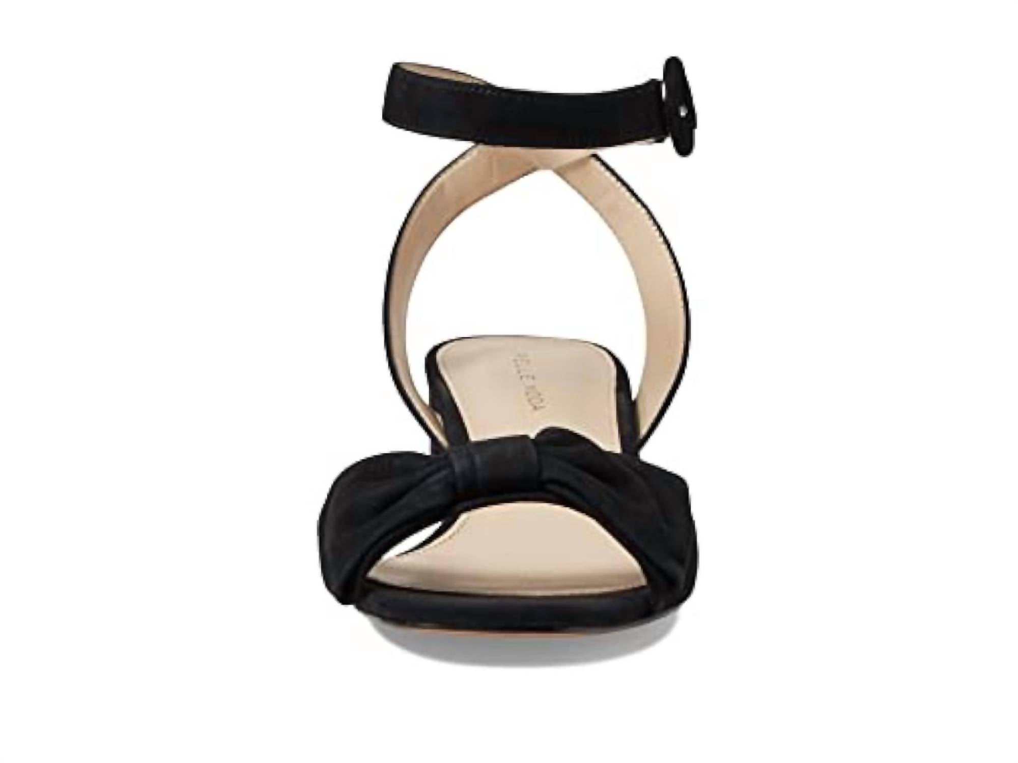 Don't be deceived, these heels are comfy as can be. Step into sophistication with the Women's Tandi Heels by Pelle Moda, a staple for any luxury wardrobe. Made from black suede, these heels feature a sleek open square toe adorned with elegant bow detailing on the front strap. The block heels offer both style and stability, secured with a classic buckle closure. Composition includes a suede upper, polyurethane lining and footbed, polyurethane midsole, and a durable leather outsole.