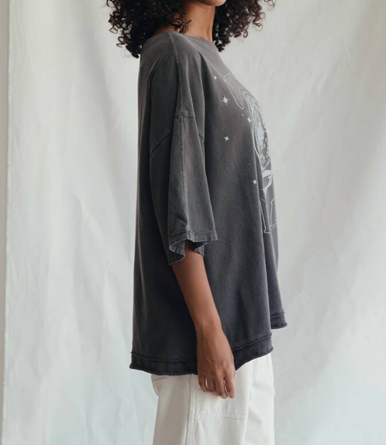 Look no further, you just found your perfect tee! Embrace the spirit of the Grateful Dead with the Shakedown Street Oversized Tee by People of Leisure, an effortlessly cool addition to any collection. Featuring elbow sleeves and crafted from 100% organic cotton, this one-size-fits-all tee in vintage black promises comfort and style. Made ethically in Los Angeles, this graphic pull-on piece is designed to celebrate the legendary tunes of 1978. Care instructions include machine washing cold or warm and tumble drying on low.