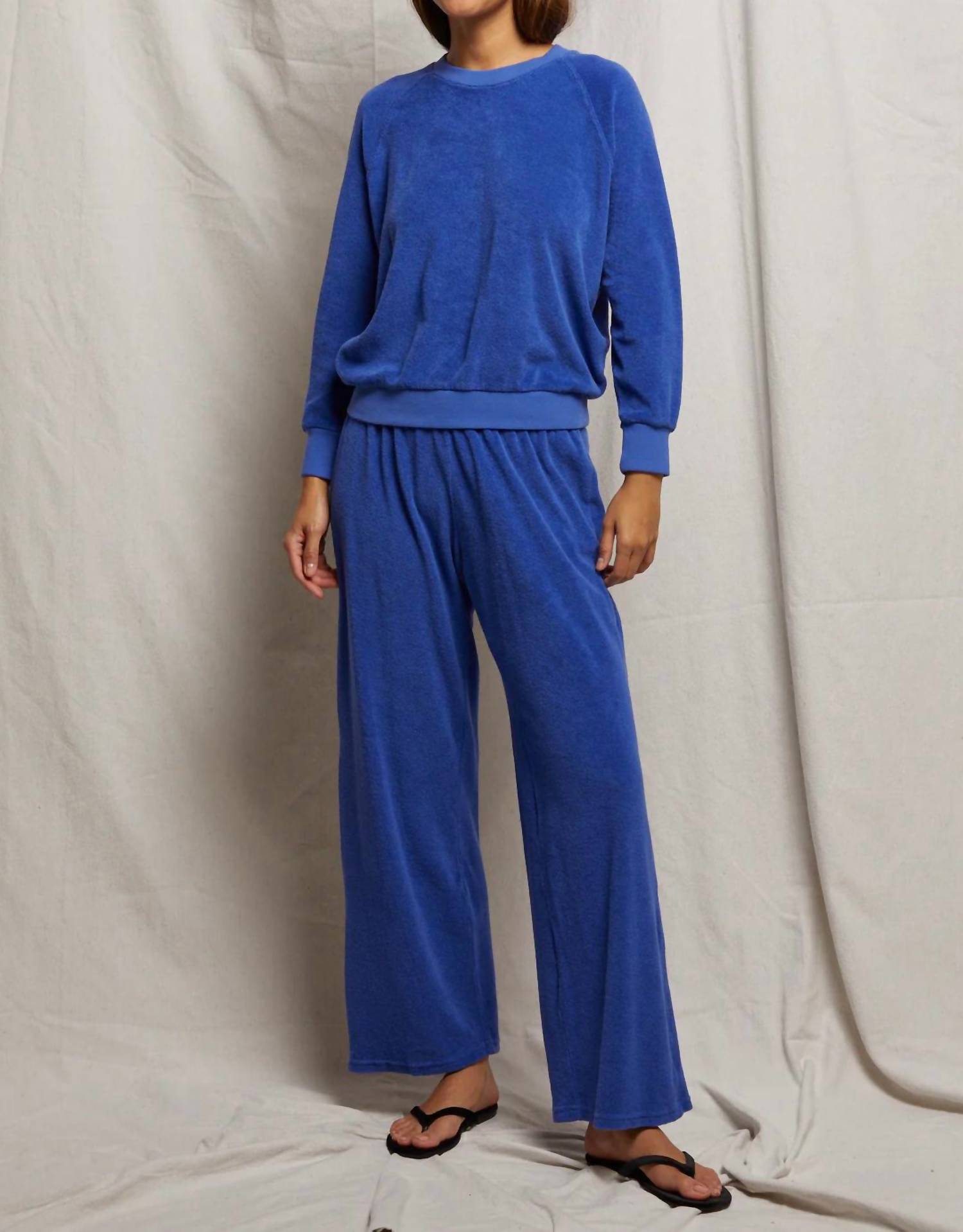 Whether you're running around town or lounging at home, this sweatshirt works for both. Introducing the Saylor Terry Sweatshirt by perfectwhitetee, a relaxed piece in vibrant Violet Blue designed for casual comfort and style. Featuring varsity-style raglan shoulders with long sleeves, this sporty sweatshirt is crafted from 100% cotton in medium-weight French terry fabric. Made in the USA, its pull-on closure adds to the easy, laid-back vibe perfect for a 90s fashion trend. Care instructions include hand washing with cold water, making it a practical addition to any fall wardrobe.