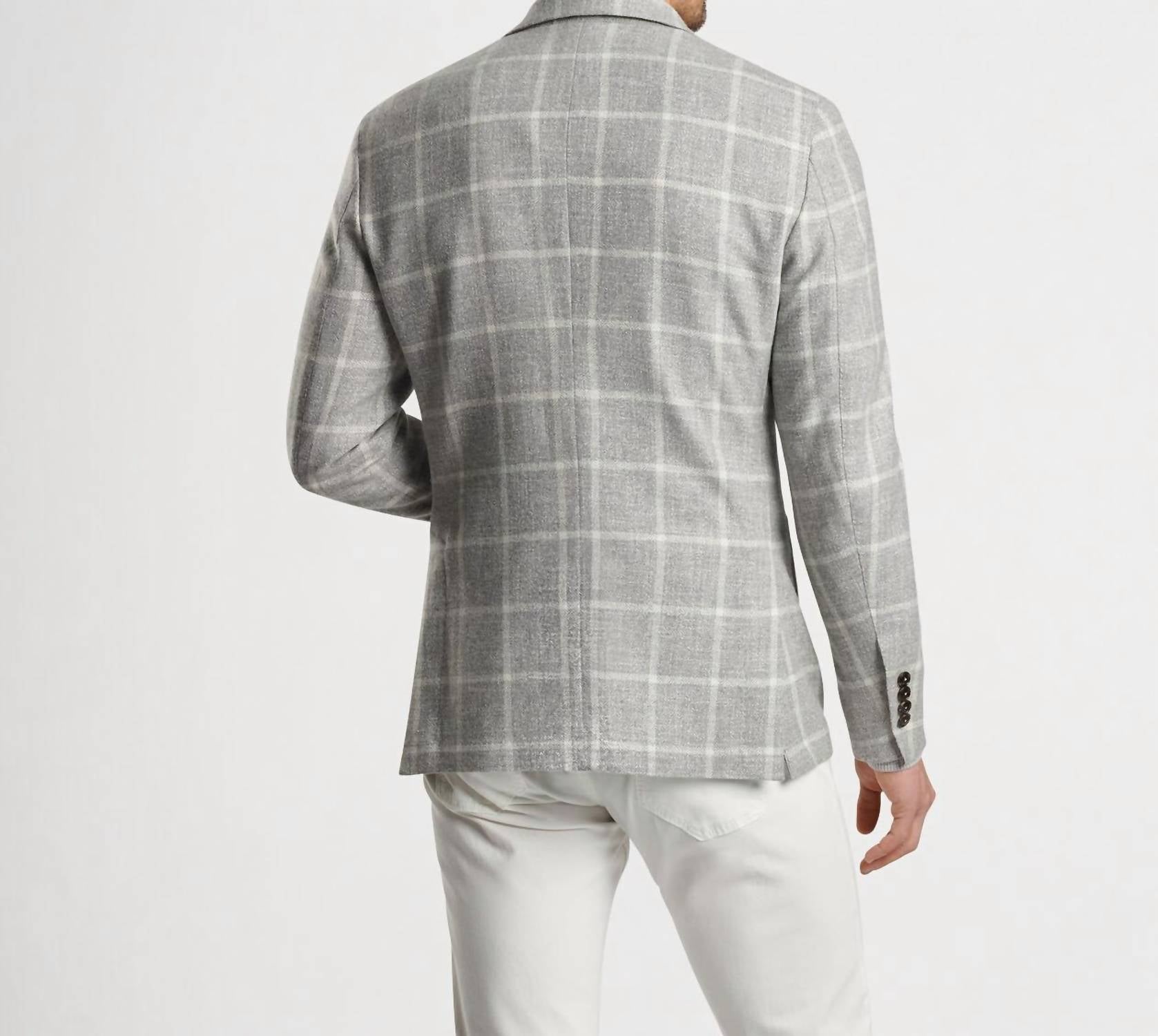Elevate your wardrobe with the Dunne Windowpane Soft Jacket by Peter Millar, designed for the modern man in sleek Gale Grey. This long-sleeve wool blend jacket is crafted in Italy, featuring a natural shoulder for comfortable wear, and a half-lined interior with a touch of stretch. Adorned with a notched V-neck lapel, barchetta chest pocket, and detailed teardrop buttonholes, it also includes genuine Italian horn buttons for refined style. Closure: Button closure.