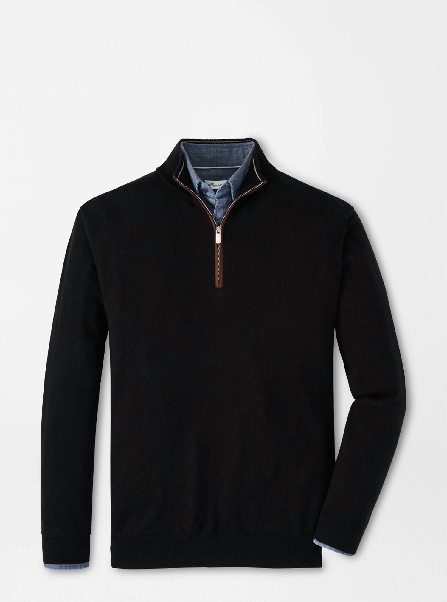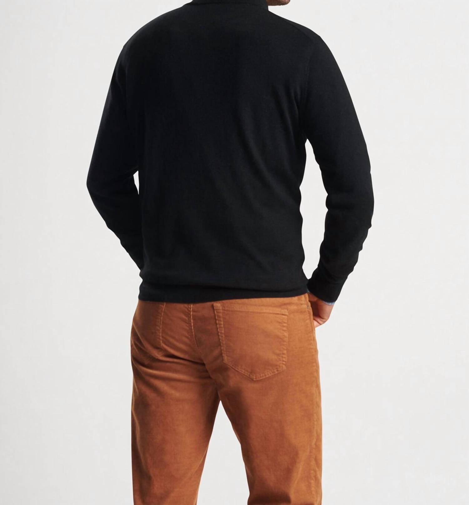 Elevate your wardrobe with the Men's Autumn Crest Suede Trim 1/4 Zip Sweater by Peter Millar, a sophisticated piece in classic black. Crafted from an exquisite blend of Merino wool and lyocell, this sweater offers exceptional softness and breathability while maintaining its shape. It features long sleeves and a stylish collar, enhanced by a suede trim along the zip closure for added elegance. Care: Machine wash and lay flat to dry.