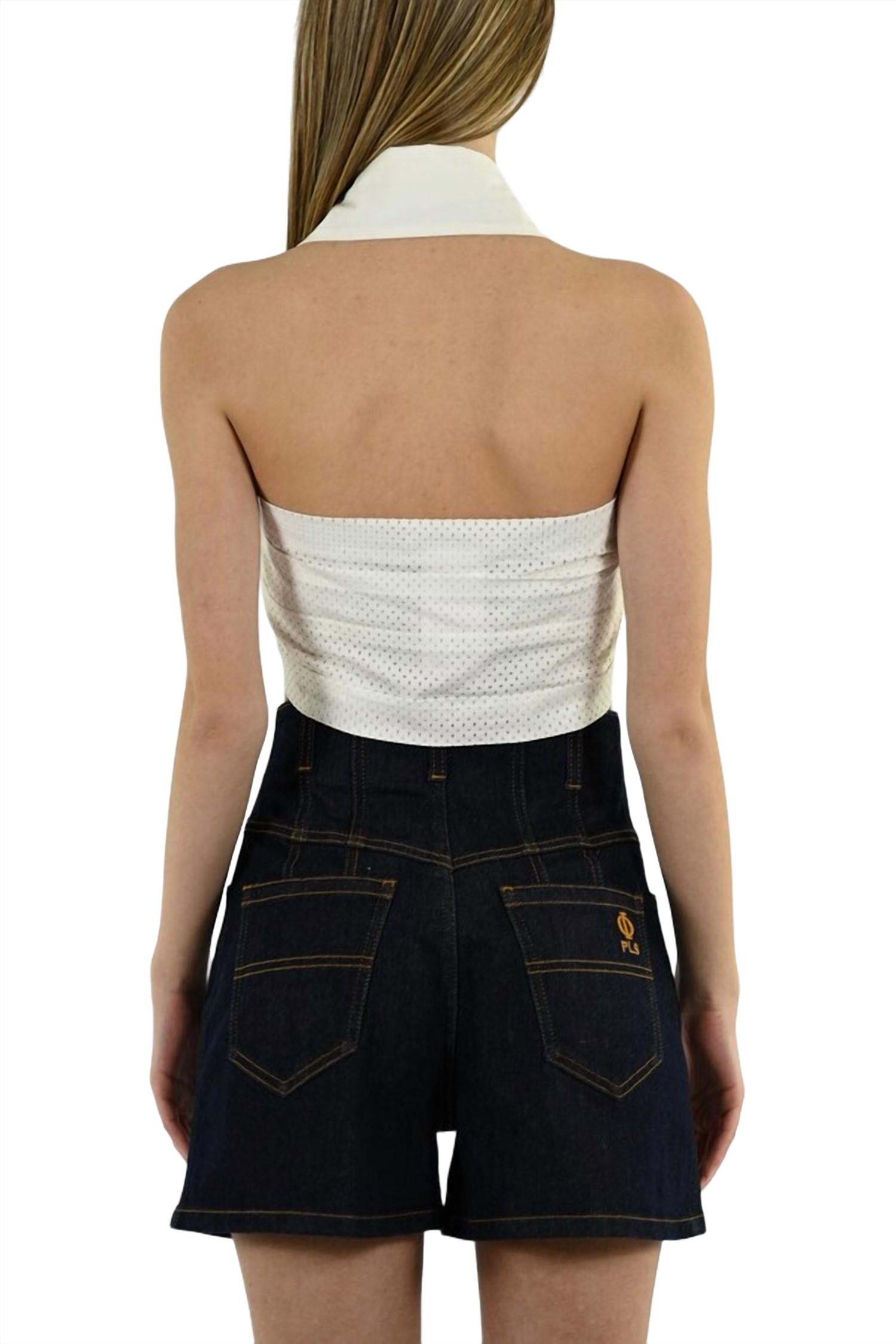 Show a little skin in this cute and casual crop top.Stretch poplin crop top with a geometric design and central buttoning. Features a lapel collar for a classic look. Composition: 97% Cotton, 3% Elastane. Fits true to size.