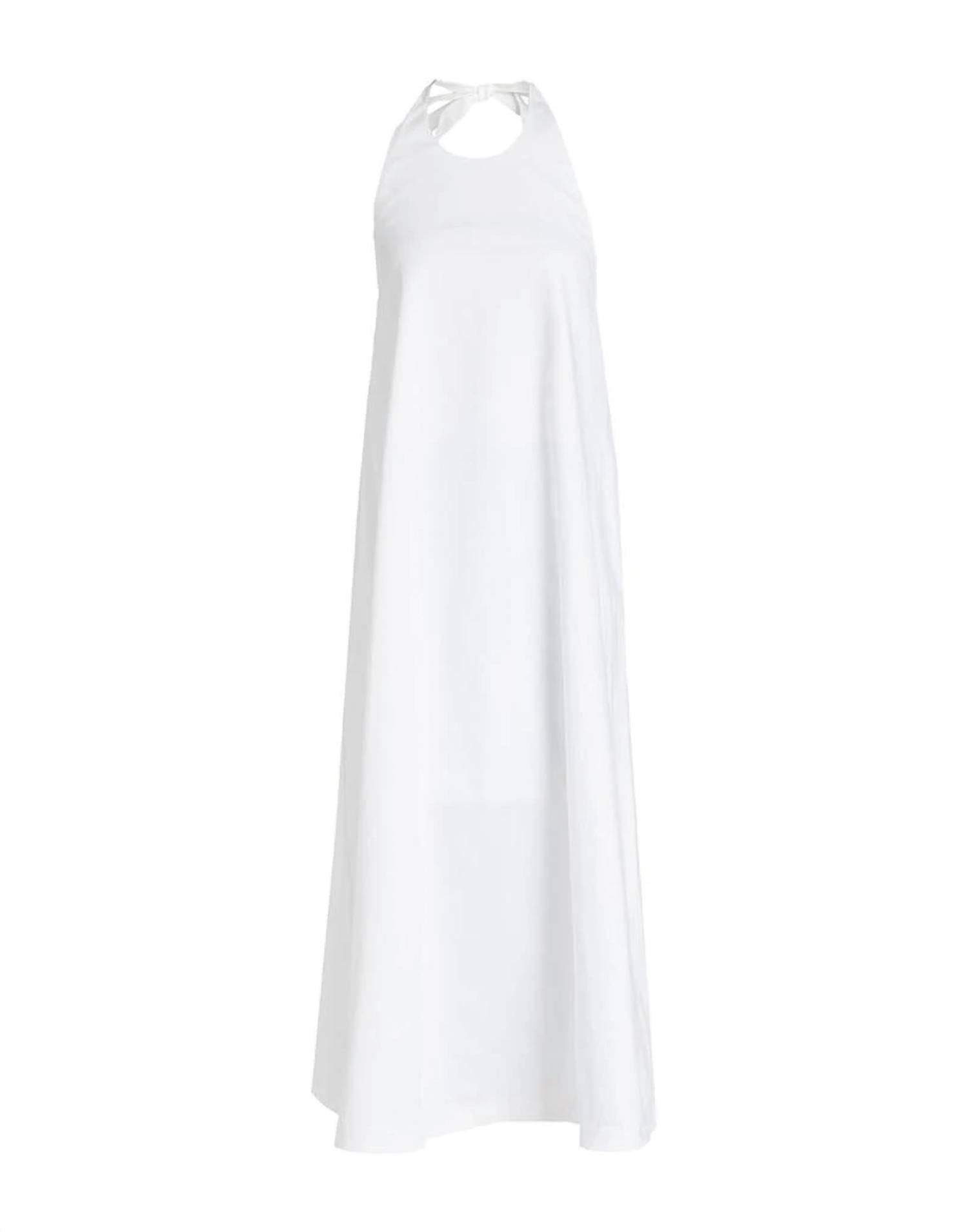 Just add slides or mules and you are good to go. This dress is crafted from a mid-weight cotton-blend fabric with a touch of stretch for added comfort. It features a halterneck design with an open back and ties at the back for an adjustable fit. The gathered detailing adds texture and shape, while two side slit pockets provide functional style. The fabric offers a slightly stretchy feel, combining structure with ease of movement.