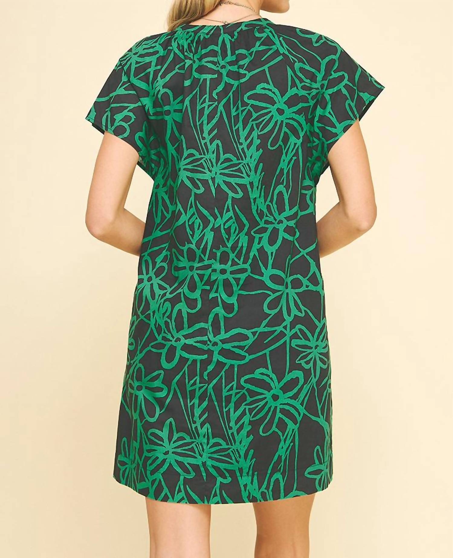 A short and breezy dress for those warmer days. Introducing the Sasha Geo Print Mini Dress by PINCH, a Boho Chic piece perfect for your Spring wardrobe. This shift dress features short cap sleeves and a striking large-scale geometric pattern in black and bright green. Crafted from 100% Cotton with a 100% Polyester lining, it measures 35.5" in length for size small and offers convenient pockets. With a pull-on closure, care for this dress with a simple hand wash.