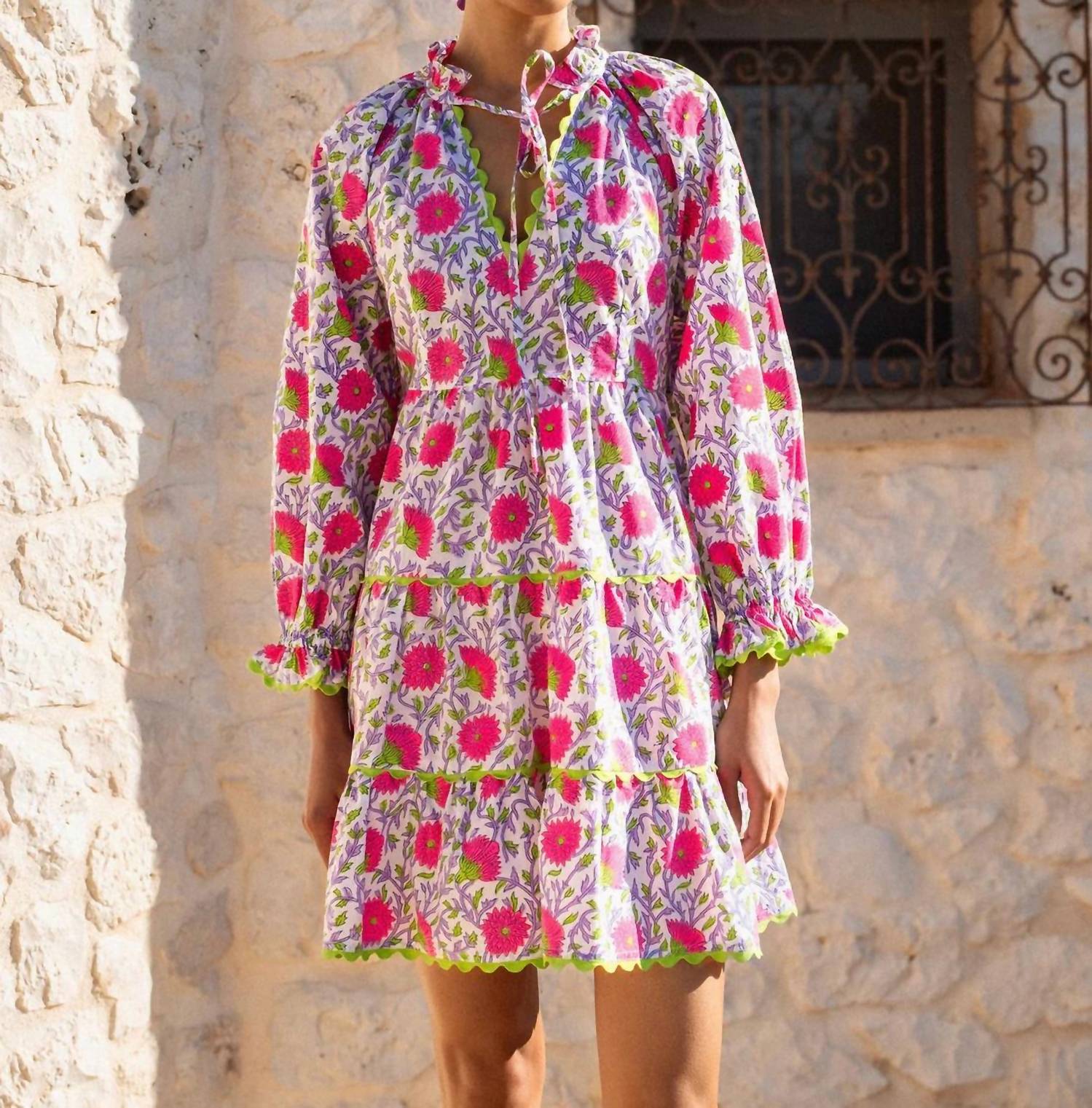 The perfect mini dress for those warmer months. Discover the Luna Mini Dress by Pink City Prints, a playful and vibrant piece that embodies boho chic style. This sheath silhouette features long balloon sleeves and a high frill neckline with tie-bow details, showcasing hand block-printed organic cotton in bold neon pink florals and vibrant purple and green. Mini in length and boasting practical side seam pockets, it’s an eye-catching choice for beach days. Made in India from 100% GOTS certified organic cotton, it's designed for easy care with machine wash cold instructions and features a convenient pull-on closure.