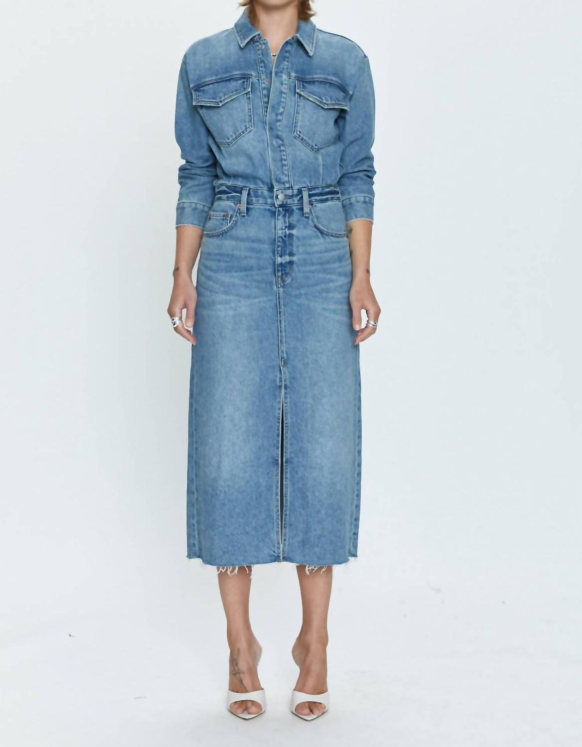 A midi dress so versatile, your options for wearing it are endless. Experience effortless style with the Amira Denim Dress by PISTOLA, a chic piece in the shade Marcel. The silhouette features long sleeves and flows into a 51.5-inch midi length, complete with a button closure hidden by a sleek placket. Expertly crafted from 100% Cotton, it offers durability with no stretch, alongside practical pockets and a stylish collar neckline. Care is simple: machine wash and tumble dry for easy maintenance.