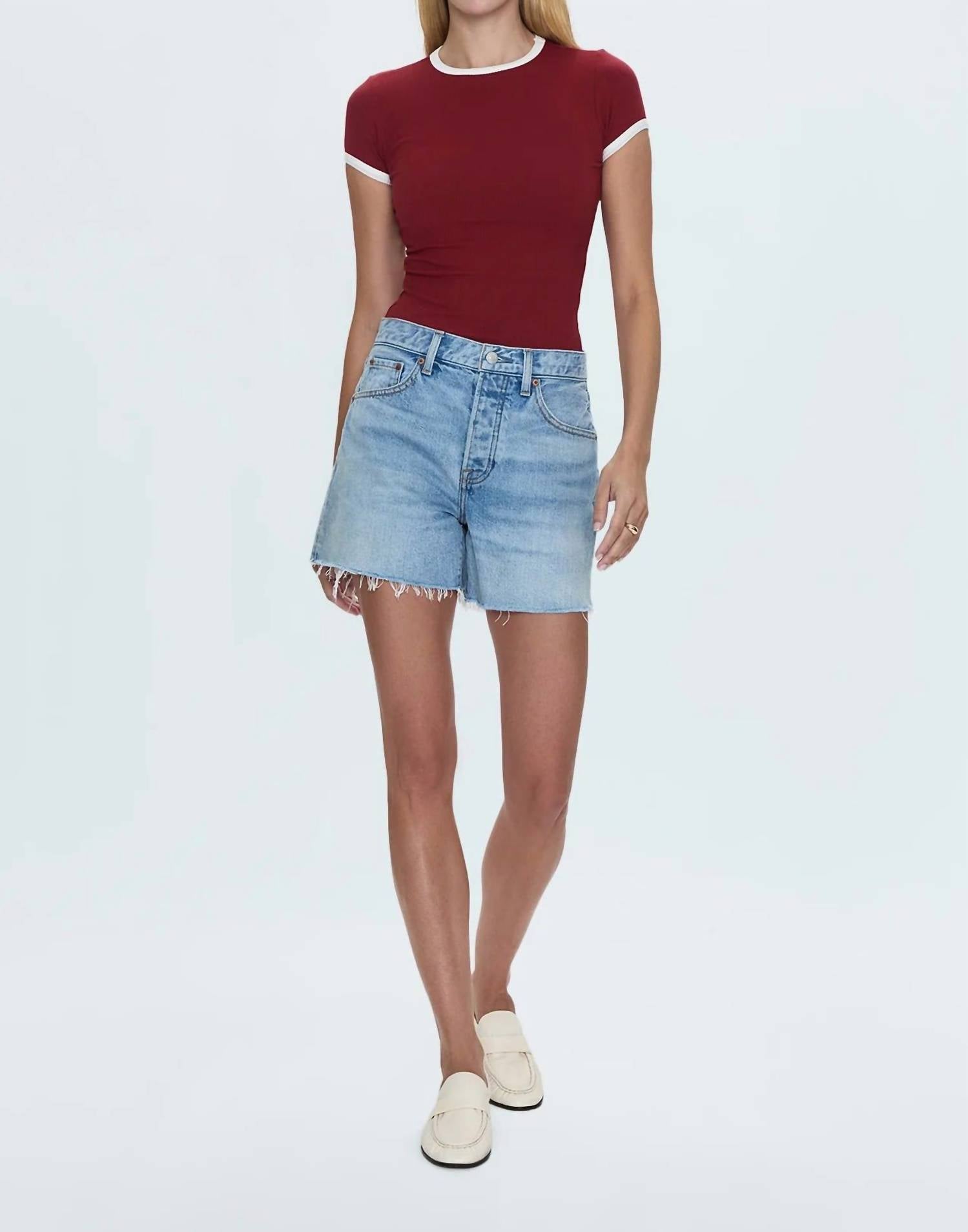 You can never have too many jean shorts and these will be your new favorites. Introducing the Andie Denim Short by PISTOLA, the perfect high-rise cut-off shorts for your summer wardrobe. Made from 100% cotton with a solid pattern in the stylish Notion color, these shorts offer a flattering fit and a vintage feel. Featuring a button closure and functional pockets, they are imported and machine washable for convenience. Designed with a rise of 11 inches, an inseam of 4.5 inches, and a leg opening of 24 inches, these shorts are ideal for streetwear and vacation occasions.