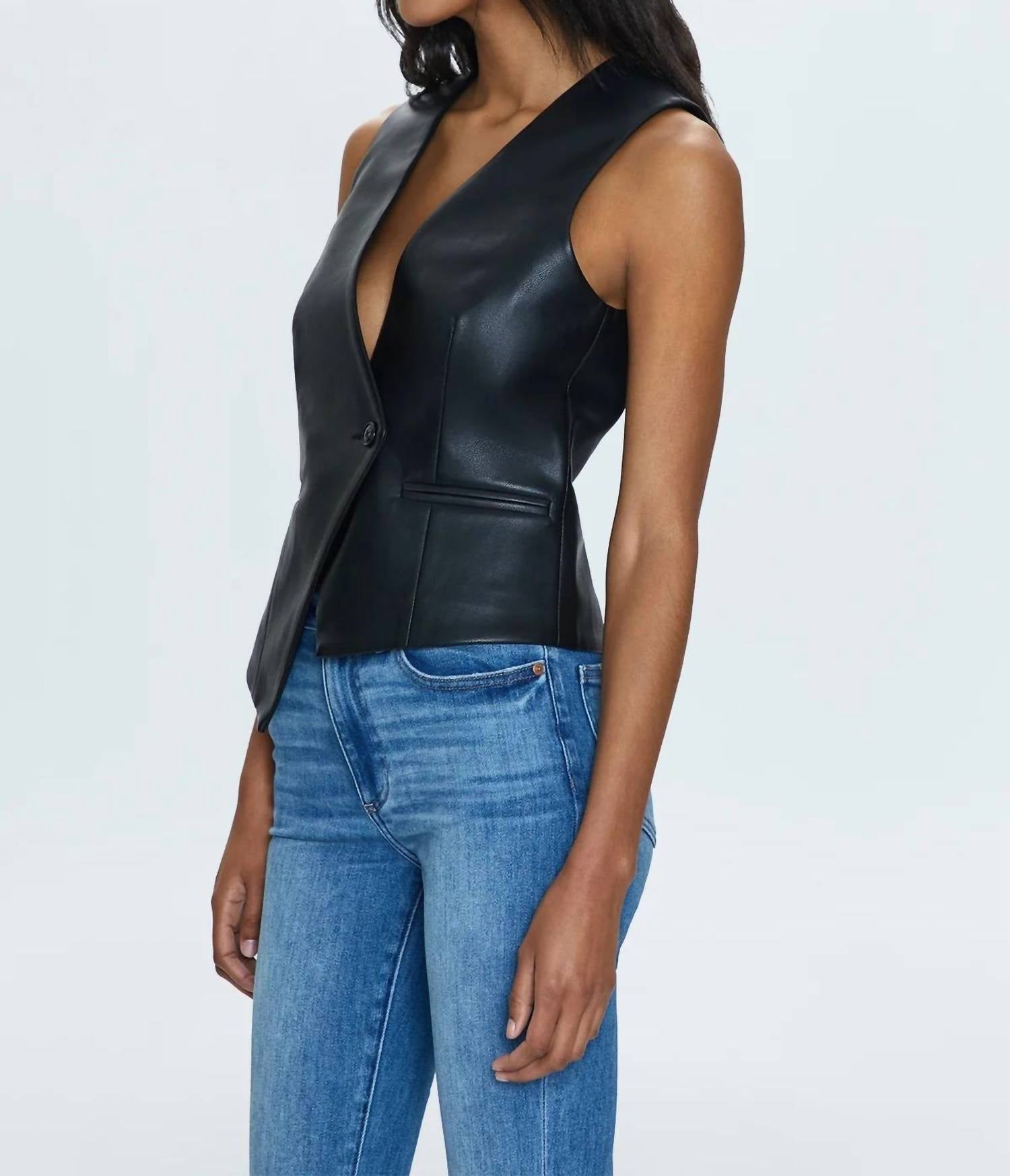 A vest so versatile you can mix and match it with almost any outfit and it will feel brand new every time. Discover the Arabella Vegan Leather Vest by Pistola, a stylish piece designed in a sophisticated slate black hue. Crafted from high-quality polyester, this sleeveless vest features a deep V-neck and a trendy cropped length of 25 inches. The vest includes side pockets and a button closure for practical elegance. Care for this piece by machine washing and line drying to maintain its sleek look.