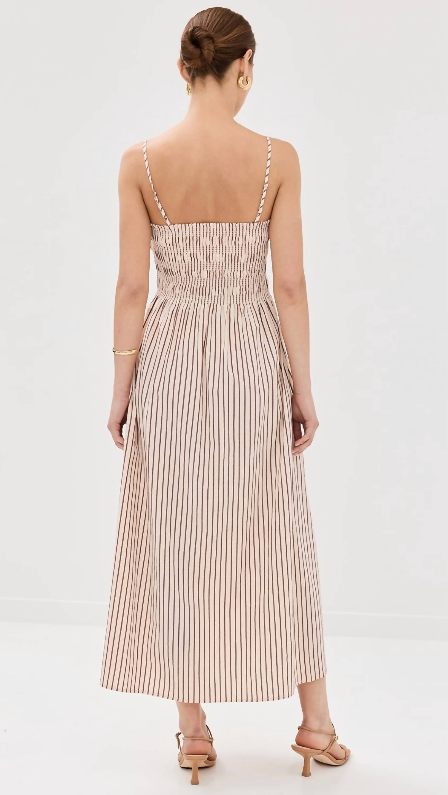 A midi dress so versatile, your options for wearing it are endless. Elevate your summer wardrobe with the Bianca Midi Dress by PISTOLA, a quintessential choice for warm-weather outings. Featuring spaghetti straps and an A-line silhouette, this dress in the Tiramisu stripe pattern offers a soft brown and warm white combination. Crafted from a breezy lightweight cotton blend, 97% Cotton and 3% Spandex, it ensures comfort and style with a pull-on closure. Care for this seasonal staple is simple with machine wash instructions.