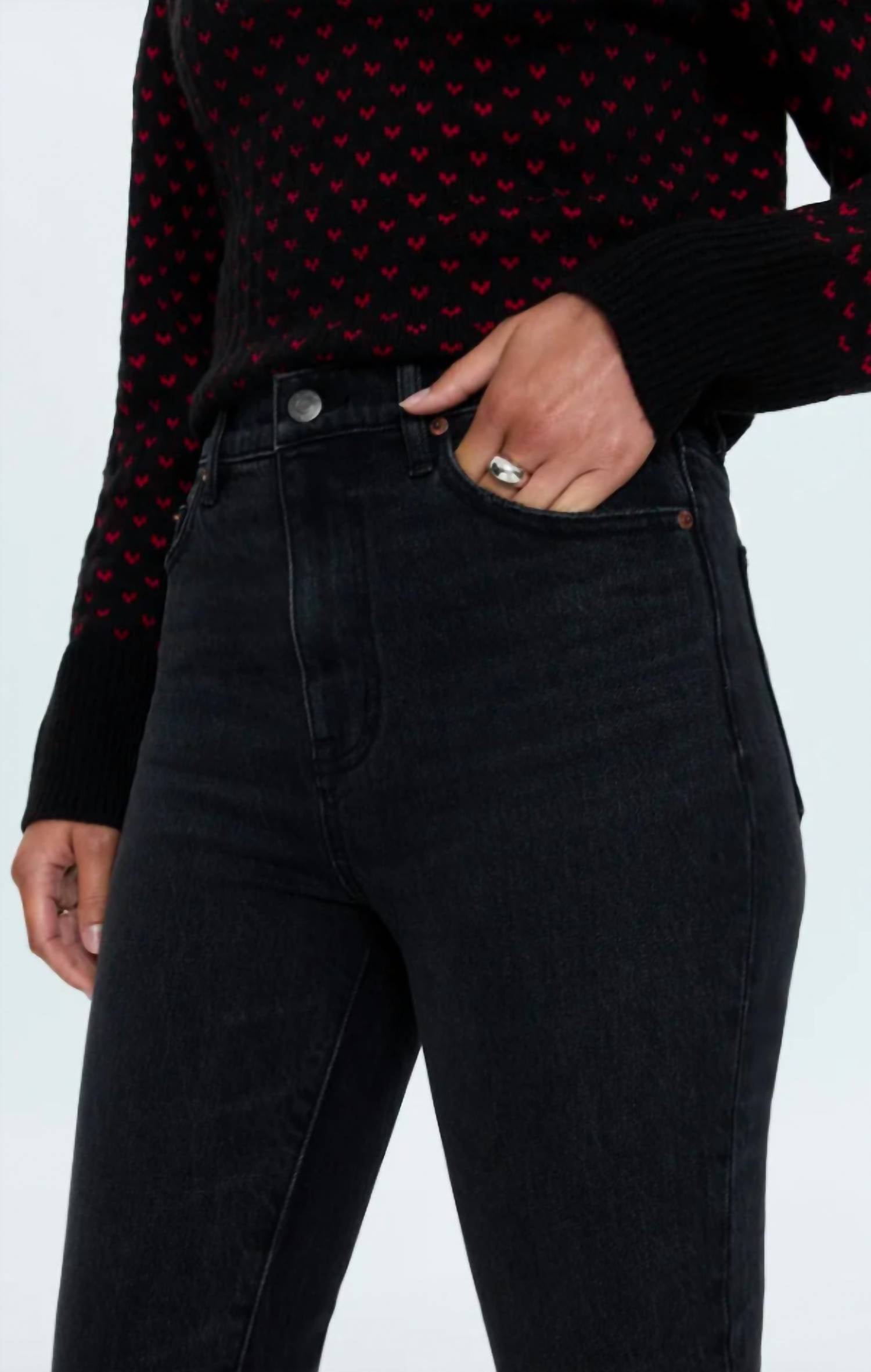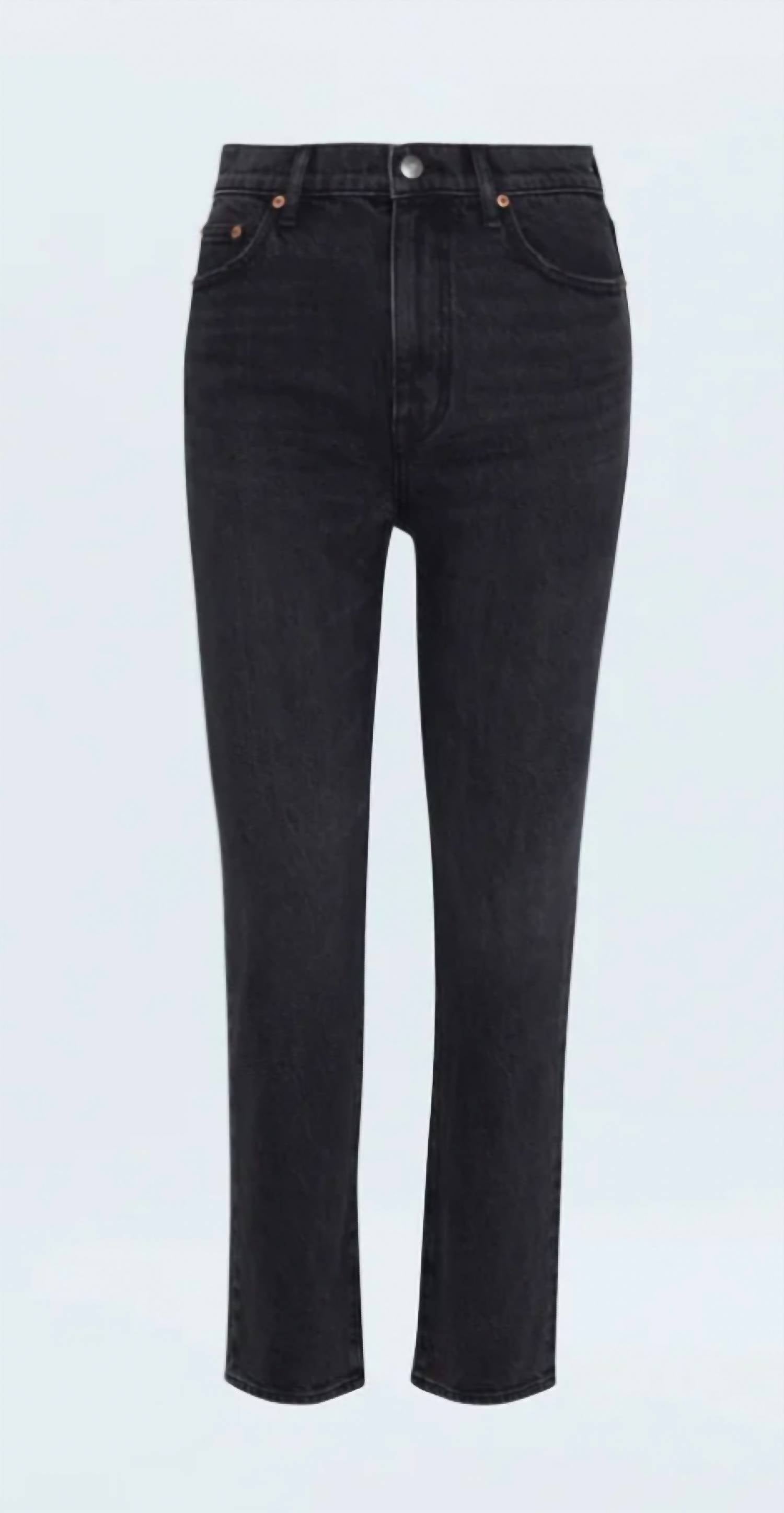 Pair these straight leg jeans with flats, sandals or even heels! You can't go wrong. High rise waist with a slim straight leg silhouette and ankle crop inseam. Crafted from their signature comfort stretch denim. Lodge is washed black denim rinse with tonal stitching and contrasting copper toned hardware accents. Rise: 11 1/2” • Leg Opening: 14” • Inseam: 28" • Model is 5'9" wearing size 26 • 77% Cotton / 22% Tencel / 1% Spandex Wash Cold Comfort Stretch