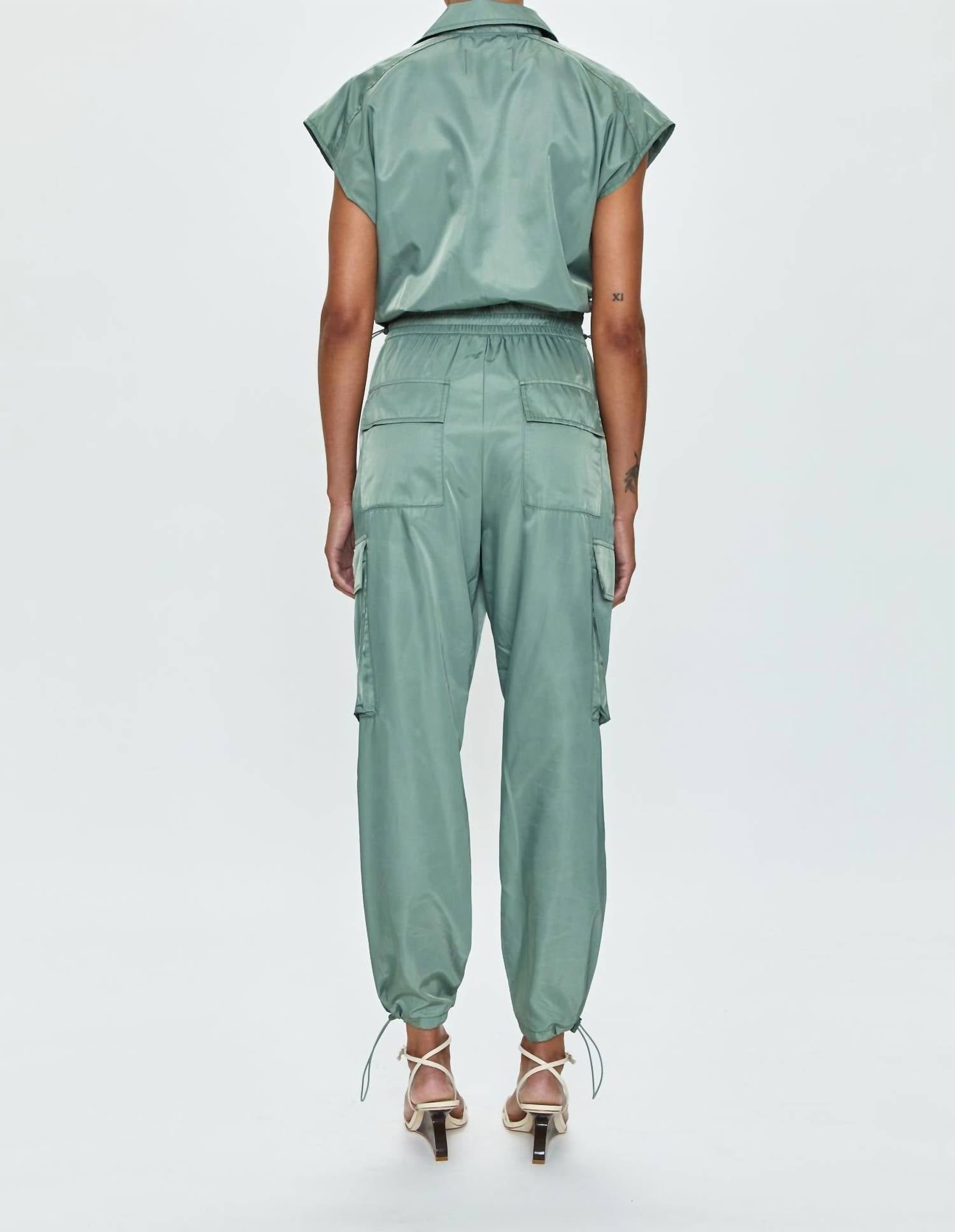 It doesn't take much for this one piece to look effortlessly cool. Add some statement jewelry to dress it up, or throw on some sneakers for a more casual vibe. Elevate your spring wardrobe with the Jade Cargo Lightweight Jumpsuit by PISTOLA, designed for both style and practicality. This women’s jumpsuit features a solid pattern and relaxed fit, crafted primarily from lightweight 100% nylon with a hint of shine for a dressy appeal, while incorporating practical cargo pockets. It includes a button closure and ankle toggle for adjustable leg style, offering versatility between a jogger or straight leg fit. Imported with a 12" rise, 30" inseam, and 16.5" leg opening, this piece best fits a workwear trend, making it an ideal choice for engagement events. Model is 5'9" wearing size small.