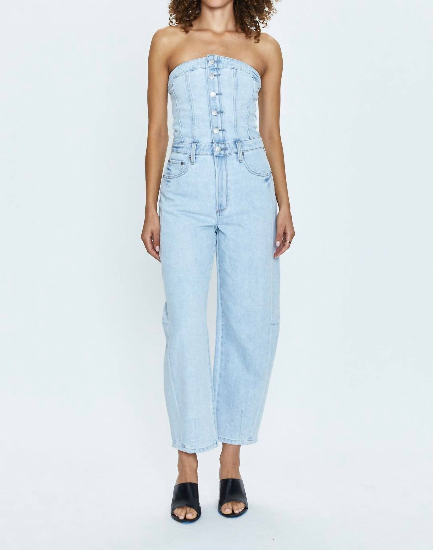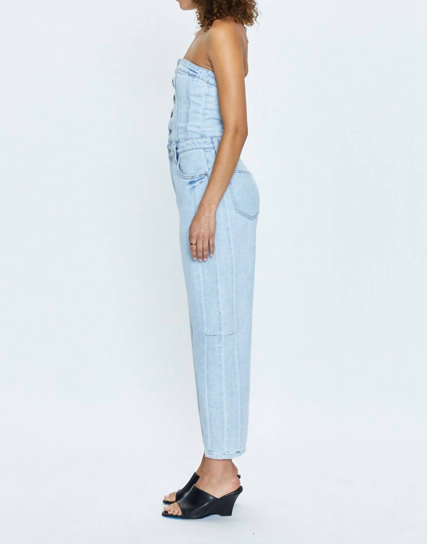 It doesn't take much for this one piece to look effortlessly cool. Add some statement jewelry to dress it up, or throw on some sneakers for a more casual vibe. Meet the Daphne Arched Leg Jumpsuit by PISTOLA, a stylish piece in the light wash Impressionist colorway that embodies vintage appeal. This strapless jumpsuit features a button-up bodice and a tapered, bowed leg silhouette, crafted from 100% cotton for a rigid, stretch-free fit. With an inseam of 27 inches and a leg opening of 16 inches, it ensures a flattering shape while providing practical pockets. Closure is achieved with a button closure, and care is simple with machine wash instructions. Model is 5'9" and wears a size small.