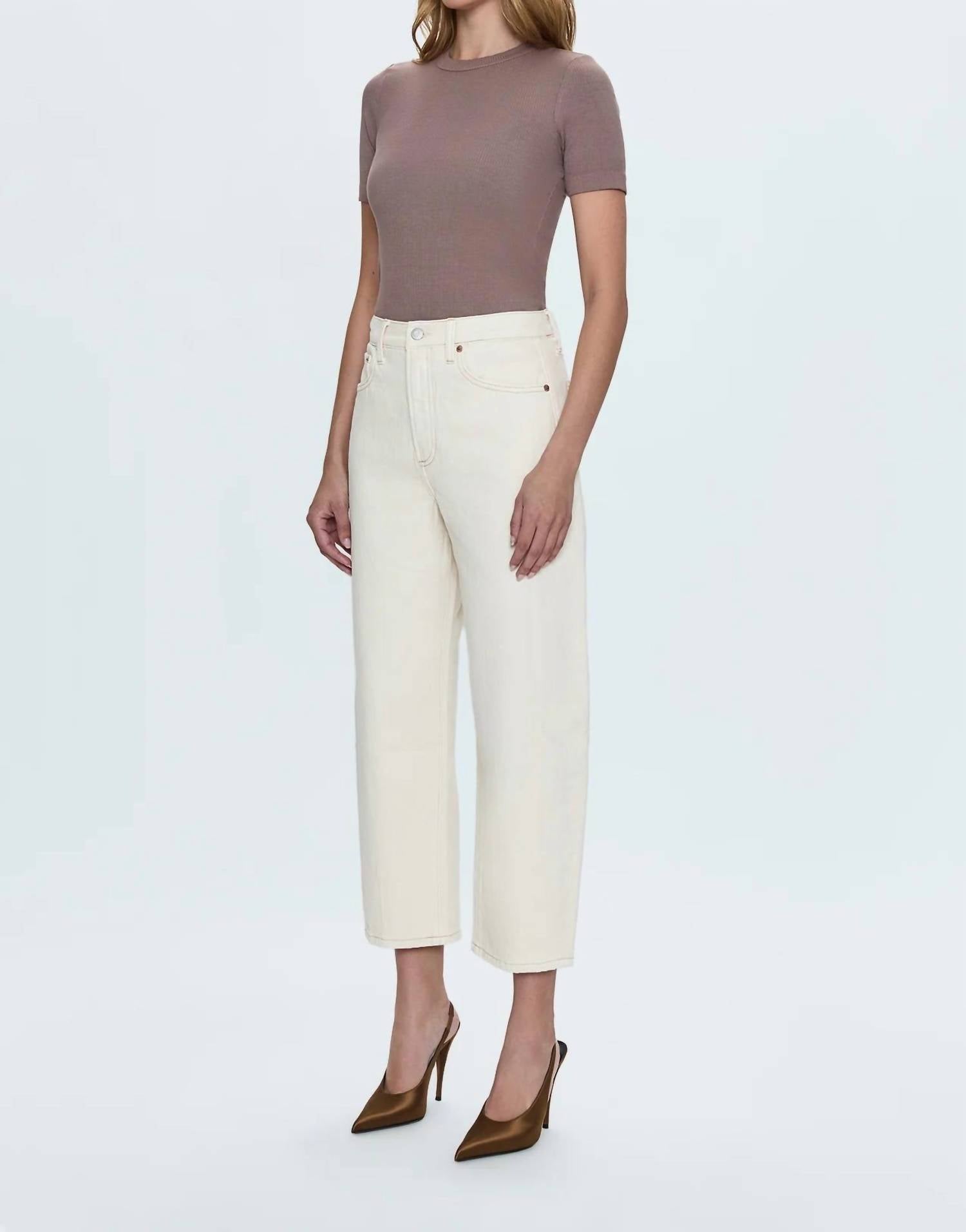 Pair these wide leg jeans with mules, slides or your favorite strappy sandals. Meet the Eli High Rise Arched Leg Jeans by PISTOLA, a standout piece in ecru with a minimalist and modern design perfect for summer getaways. These jeans feature cotton blend denim with a comfortable stretch, a 26" cropped inseam, and a high-rise 12.5" waist that offers a relaxed fit through the barrel bowed wide leg. Crafted with contrast stitching and metallic hardware, they boast a solid pattern and include practical pockets. Closure is achieved with a button, and for care, simply machine wash. Model is 5'9" wearing size 26.