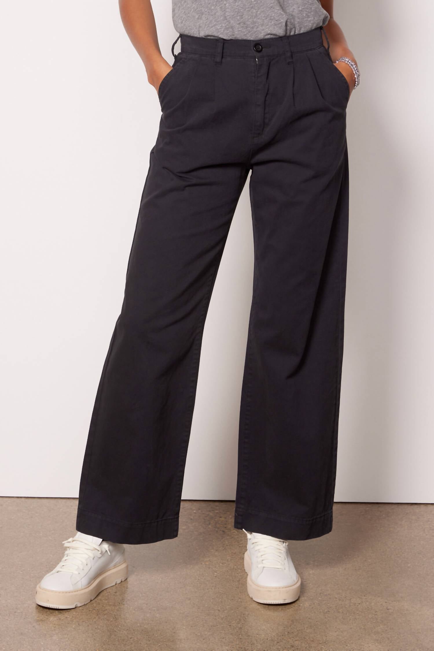 Zip fly with button closure. Side slant pockets. Back welt pockets. Pleated twill fabric. 56 cm at the knee narrows to 25 cm at the leg opening. True to size. Machine wash cold.