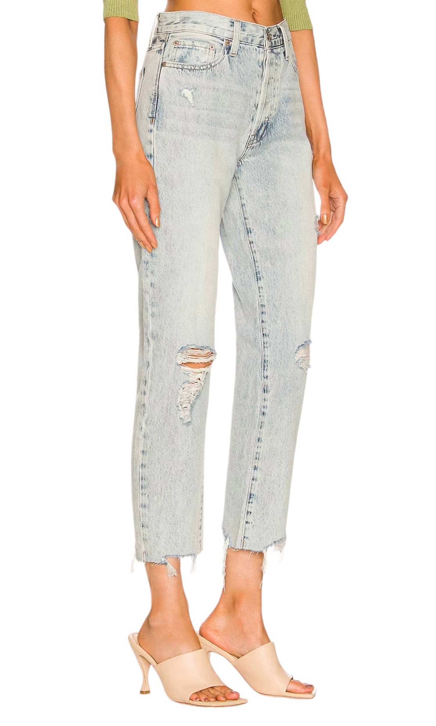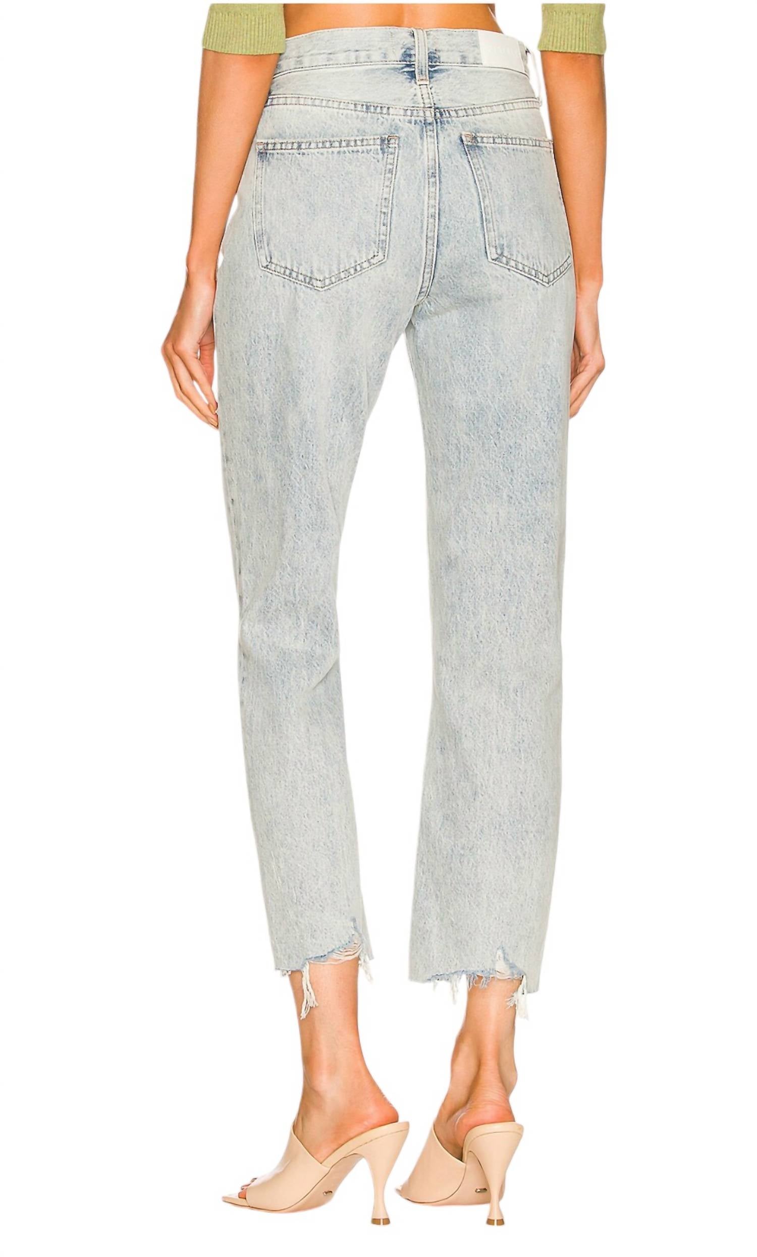 We especially love this cropped jean with a cute pair of slides or sandals. These pants have a relaxed fit with light whiskering and destroyed detail. It has a button fly and 4-pocket styling, a high-rise waist, and cropped, straight legs. It is true to size. It is 100% Cotton. Hand wash. Made In China.