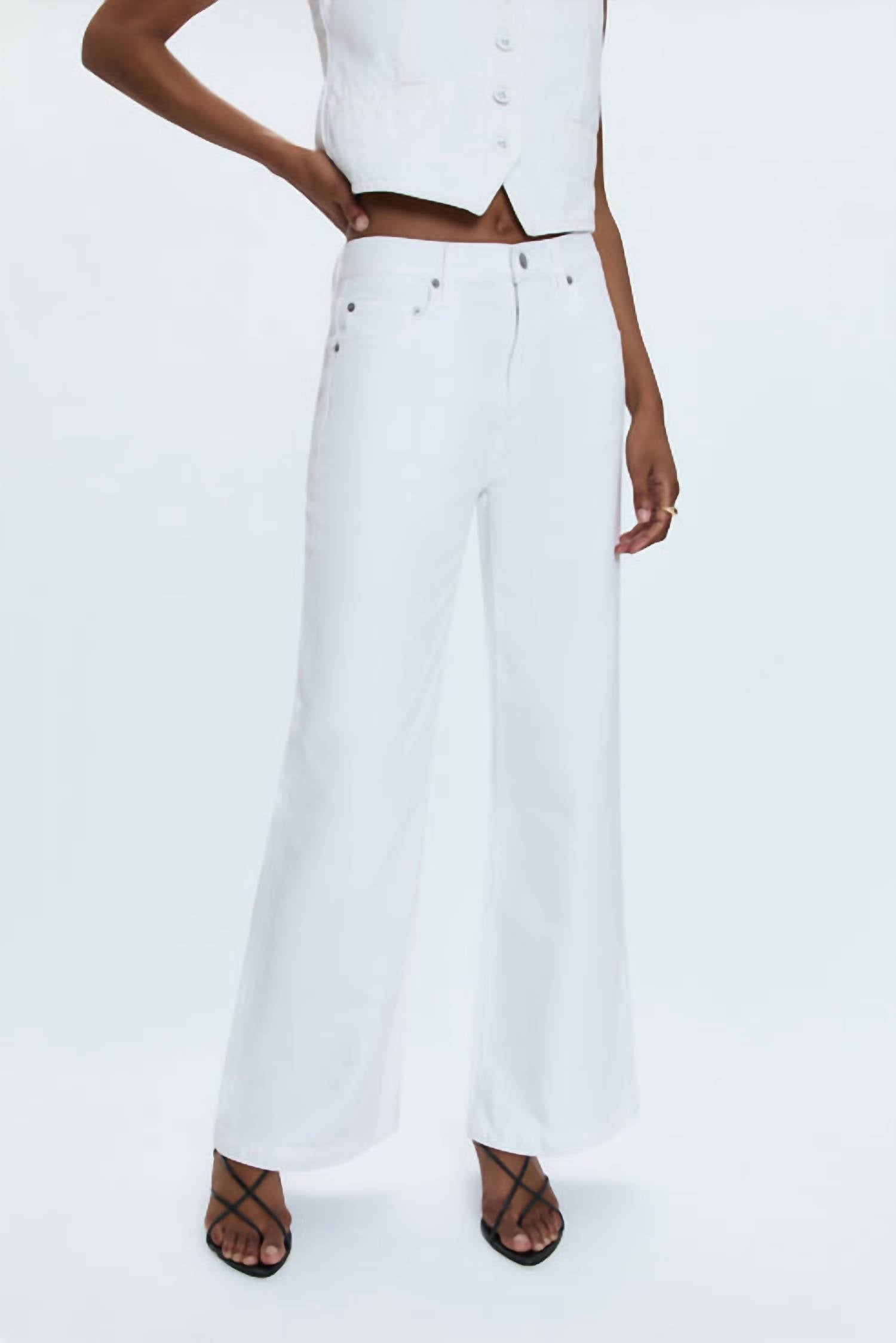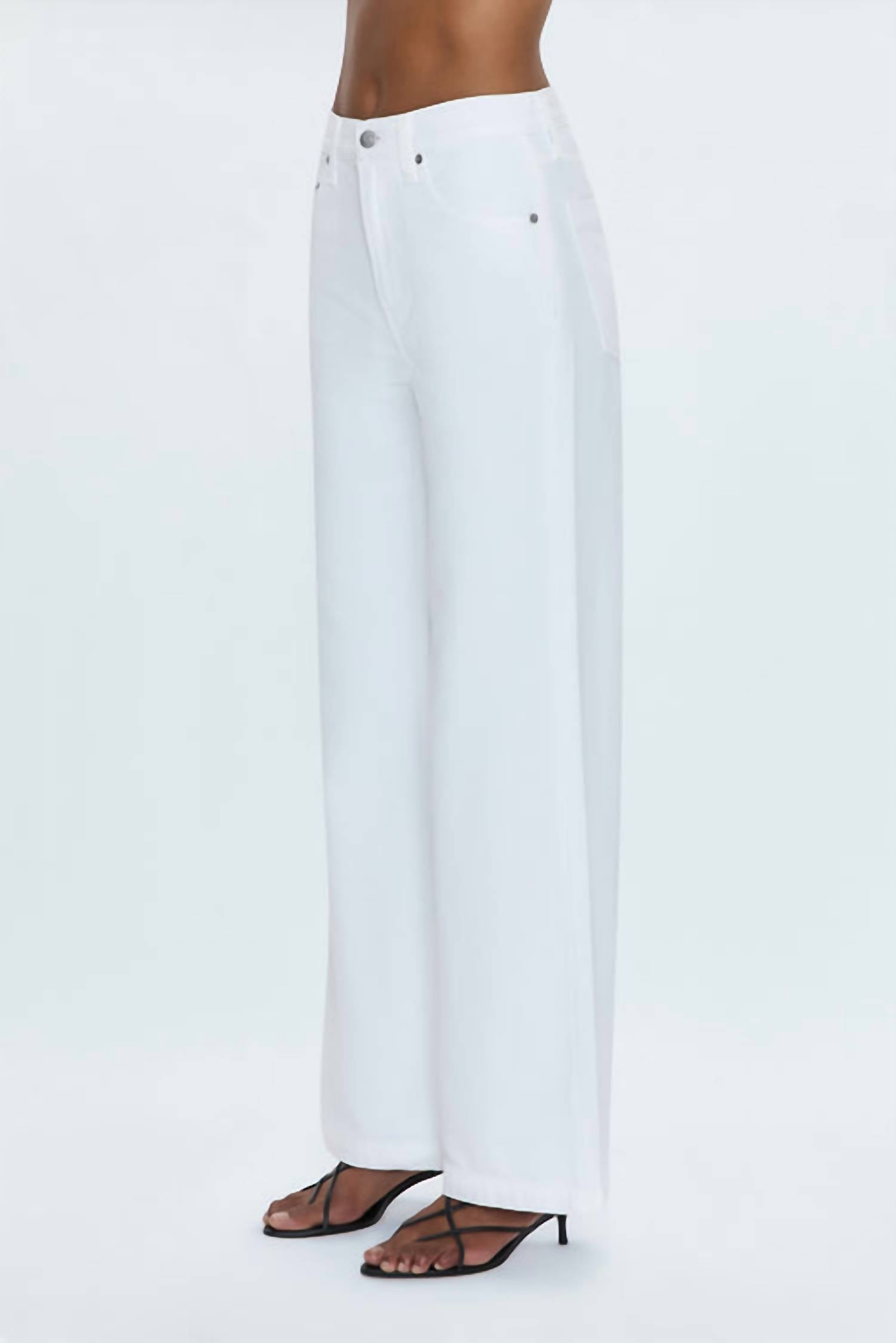 A flattering silhouette that's suprisingly versatile. Introducing the Jadyn Low Slung Palazzo Jean by PISTOLA, a chic must-have in Vivid White for your summer wardrobe. These jeans feature an 11.25" rise and 32" inseam, with a wide-leg silhouette for a relaxed, stylish fit. Crafted from a textured cotton blend, they are designed with a button closure and include pockets for convenience. Made from 62% Cotton and 38% Lyocell, these imported jeans are perfect for travel and effortless style, offering an easy-care option with machine wash instructions.