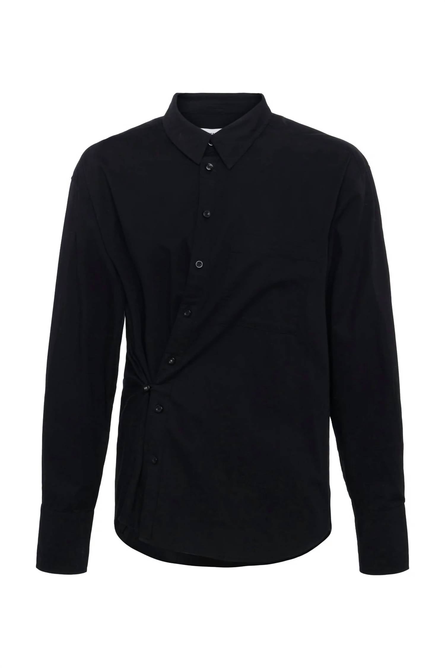 This button down shirt is comfortable yet polished. With long sleeves and a collared neckline, this shirt is made from crisp cotton poplin and is styled in a classic black. Crafted from 100% polyester in China, it features a button down closure enhanced by a unique crossover button. Effortless to care for, it’s designed for machine wash cold.