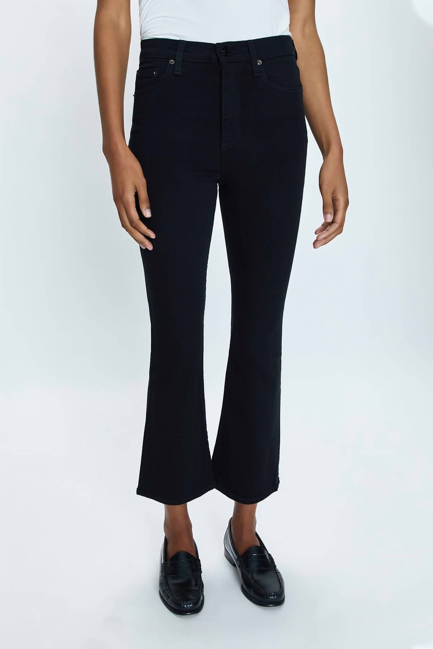 A flattering silhouette that's suprisingly versatile. Introducing the Pistola Lennon High Rise Crop Boot Jeans, a must-have for fall fashionistas seeking comfort and edge. These jeans boast a high-rise waist with an 11-inch rise and flared leg for a chic silhouette, crafted from 98% cotton and 2% elastane for exceptional comfort and stretch. Available in a solid black finish with a dark wash, they feature a button closure and are designed for a flattering bootcut with a 27-inch inseam. Effortlessly versatile, they're perfect for adding a polished touch to your dinner party ensemble, and they’re easy to care for with machine wash and tumble dry instructions.