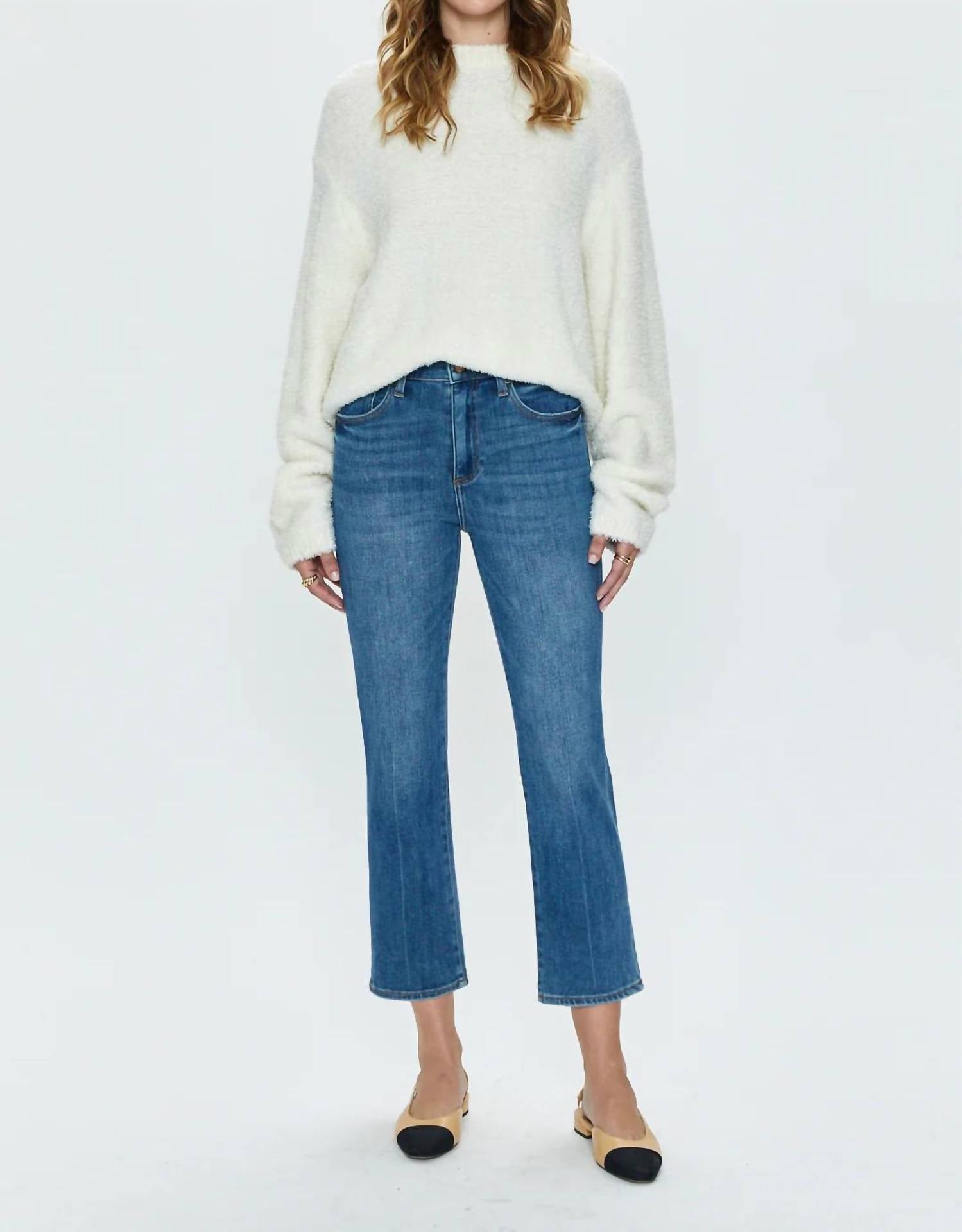 Comfortable and stylish, we love this cropped jean for all of the obvious reasons. This Lennon High Rise Crop Jeans features a high-rise waist, 27” inseam, and bootcut leg style. Crafted from a 95% cotton, 4% polyester, 1% elastane or 99% cotton, 1% elastane blend with a hint of stretch, it has a button closure and is machine washable for easy care.