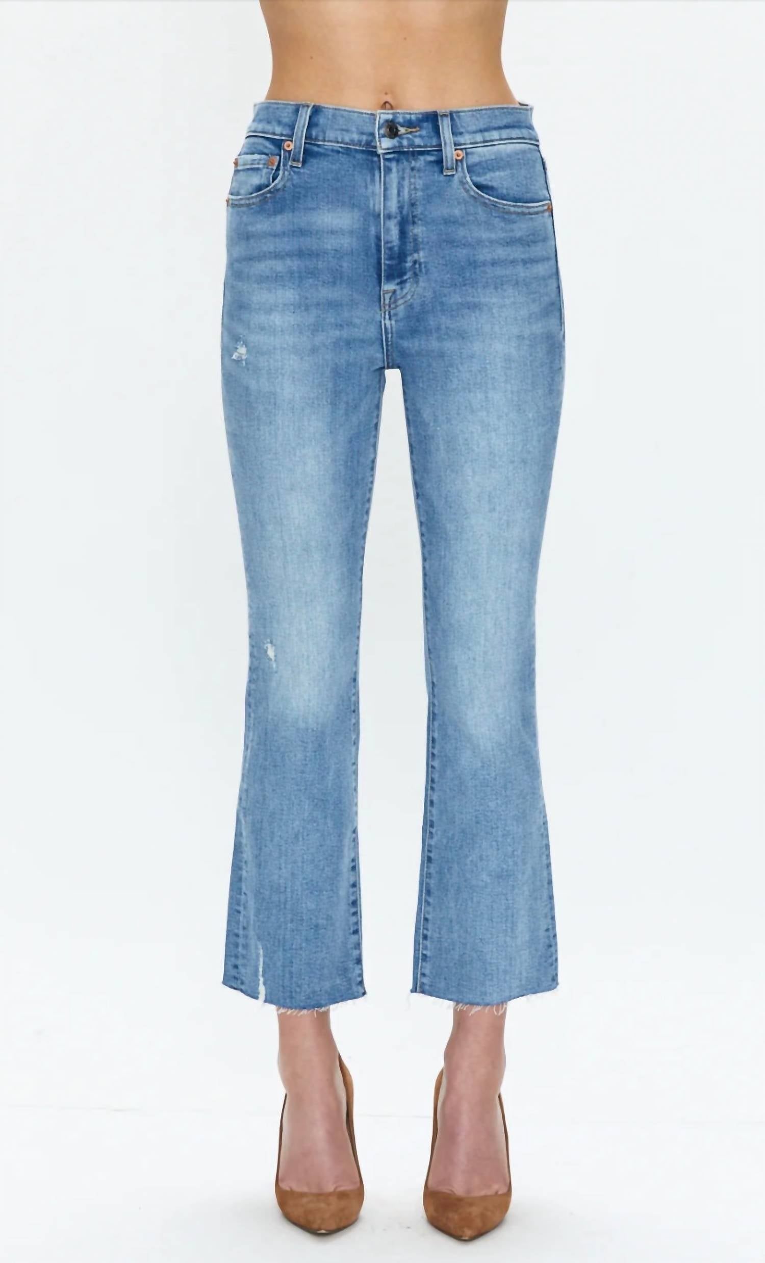 Introducing the PISTOLA Lennon High Rise Cropped Boot Jeans in striking Zuma color, a stylish choice for streetwear enthusiasts. Crafted from solid medium wash denim, these jeans feature a high-rise waist of 10 inches and a cropped 26-inch inseam, perfectly designed for pairing with statement shoes. The slim fit hugs from waist to knee, flaring into a bootcut leg with playful distressing and a shark bite hem for added flair. Ideal for travel and Thanksgiving season, these jeans are as versatile as they are fashionable.