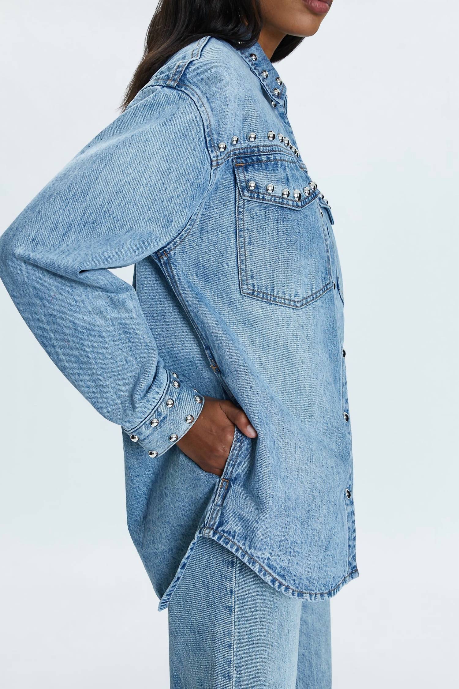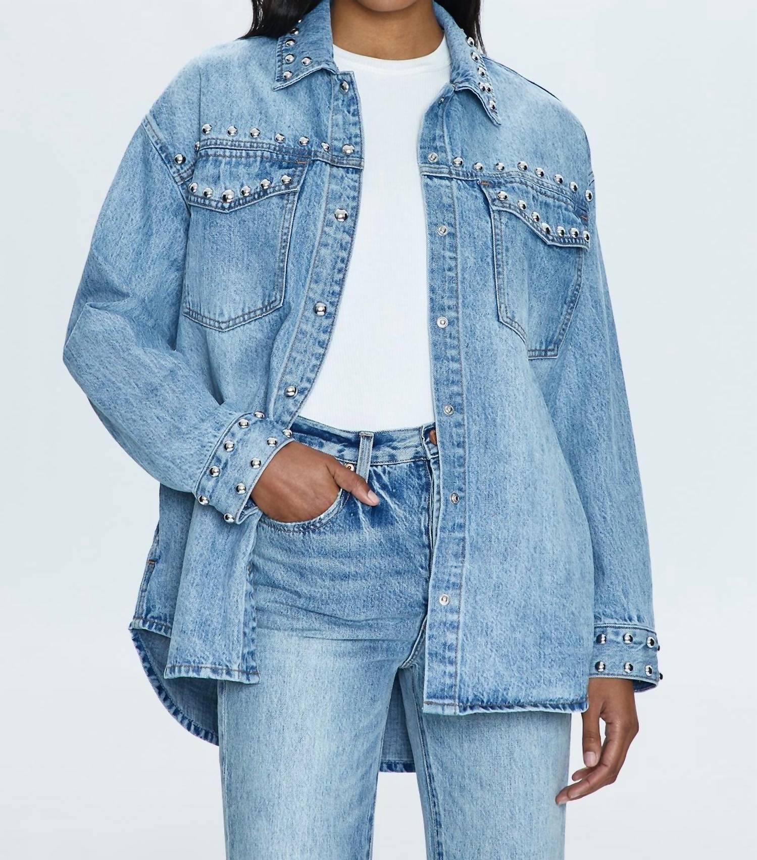 A casual yet cool jacket that every closset needs. Elevate your wardrobe with the Mandy Oversized Shacket by PISTOLA, a menswear-inspired shacket perfect for travel and Mother's Day outings. Crafted from 100% cotton in a light blue Satellite wash, this versatile piece features long sleeves, a collared neckline, and a button-up front closure. With a garment length of 30 inches, it’s adorned with linear stud decorations for a touch of streetwear flair. While care instructions are not explicitly provided, dry cleaning is recommended to maintain its stylish appeal.