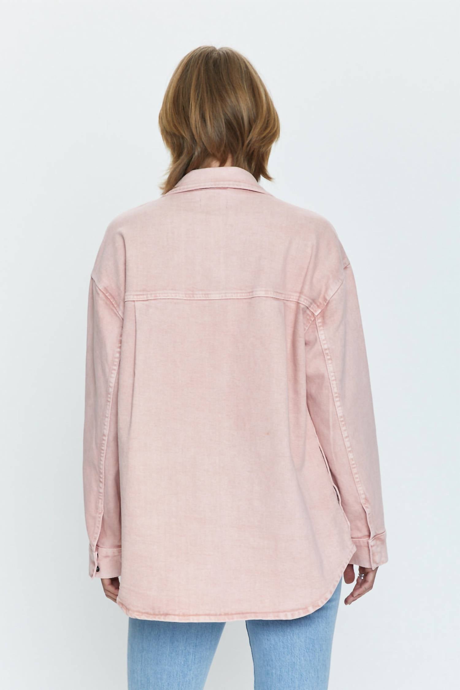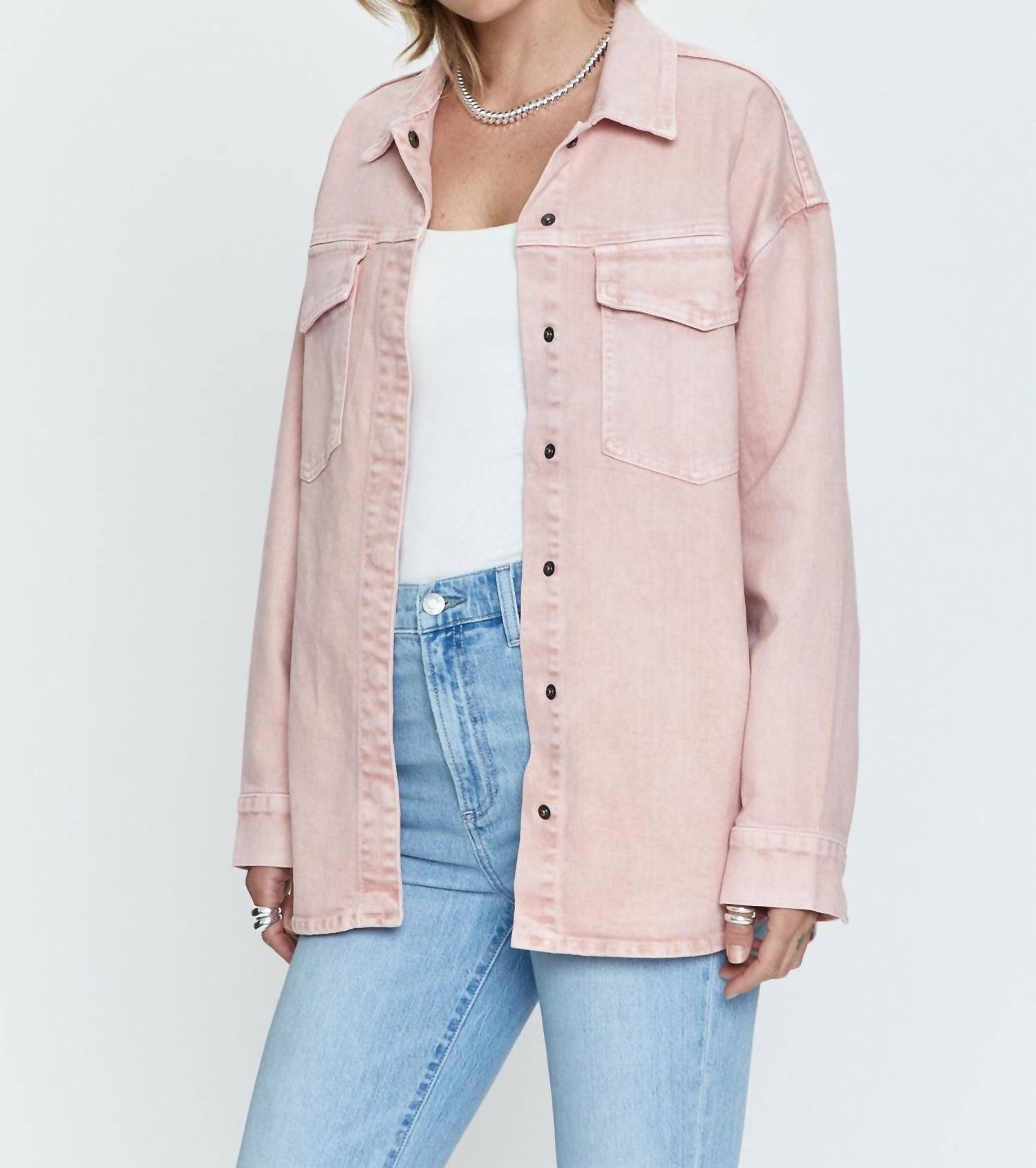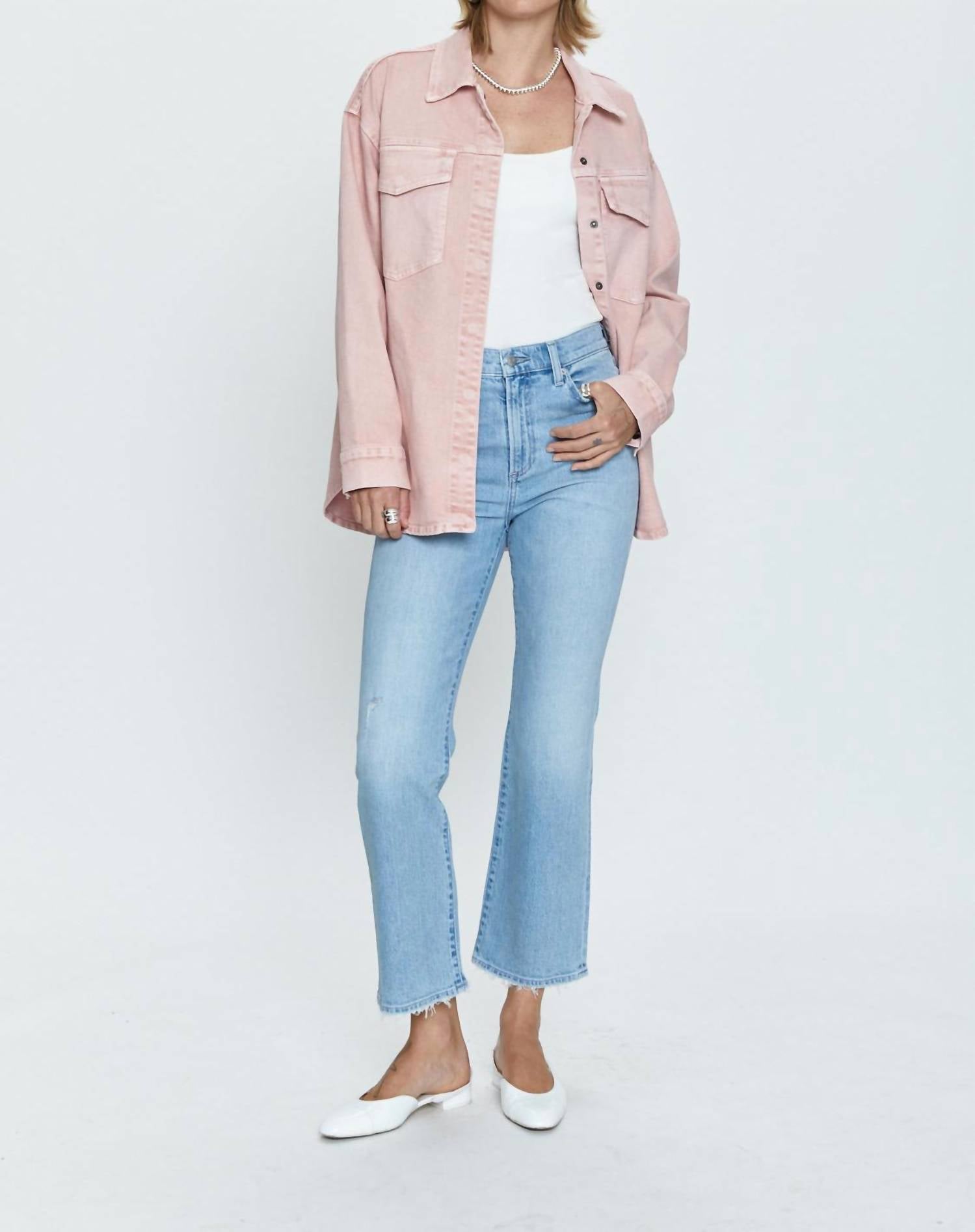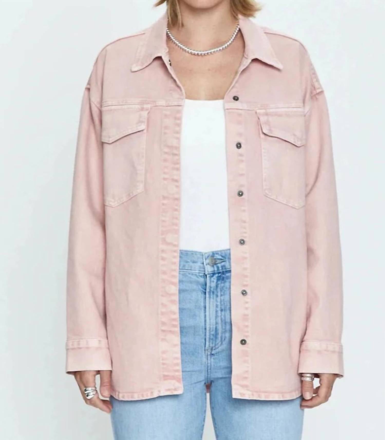 Cute, casual, and comfortable. This jacket is a must have. Embrace effortless style with the Mandy Shacket by PISTOLA, a versatile blend of a shirt and jacket in soft pink denim. This relaxed fit piece features long sleeves, a collar neckline, and a slightly cropped hem. Elevate your spring streetwear look with its dropped shoulders and button closure. Care for your new favorite layering item by machine washing as needed.