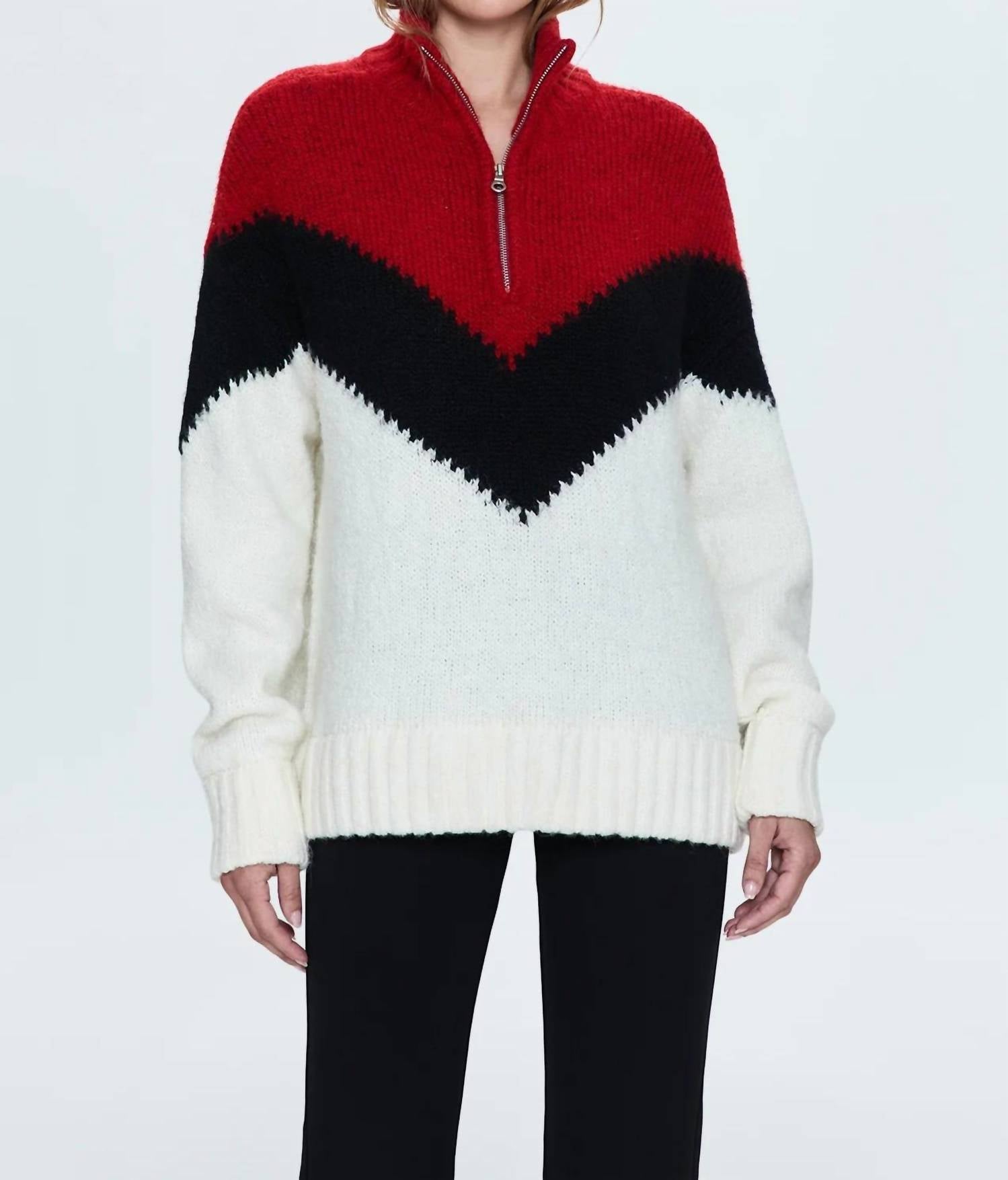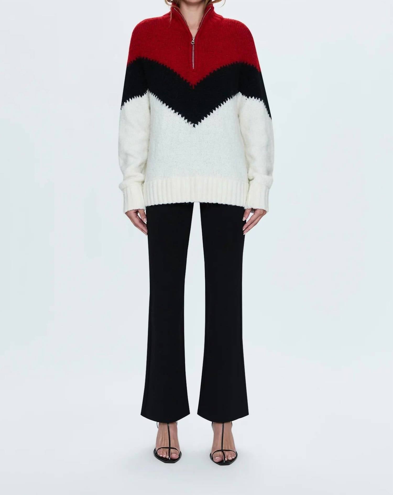Fit to perfection and effortlessly chic. Experience effortless elegance with the Maribel Sweater by PISTOLA, featuring a long sleeve design crafted from acrylic, this piece offers both comfort and style. With its 24" garment length and a quarter zip closure, it boasts a relaxed fit highlighted by a high sport collar. The multi-colored red and black chevron motif set against a cream white base makes this sweater a standout choice for any wardrobe. Care for this piece by dry cleaning only to maintain its pristine look. 64% Acrylic / 13% Polyester / 8% Alpaca / 9% Nylon / 4% Wool / 2% Spandex.