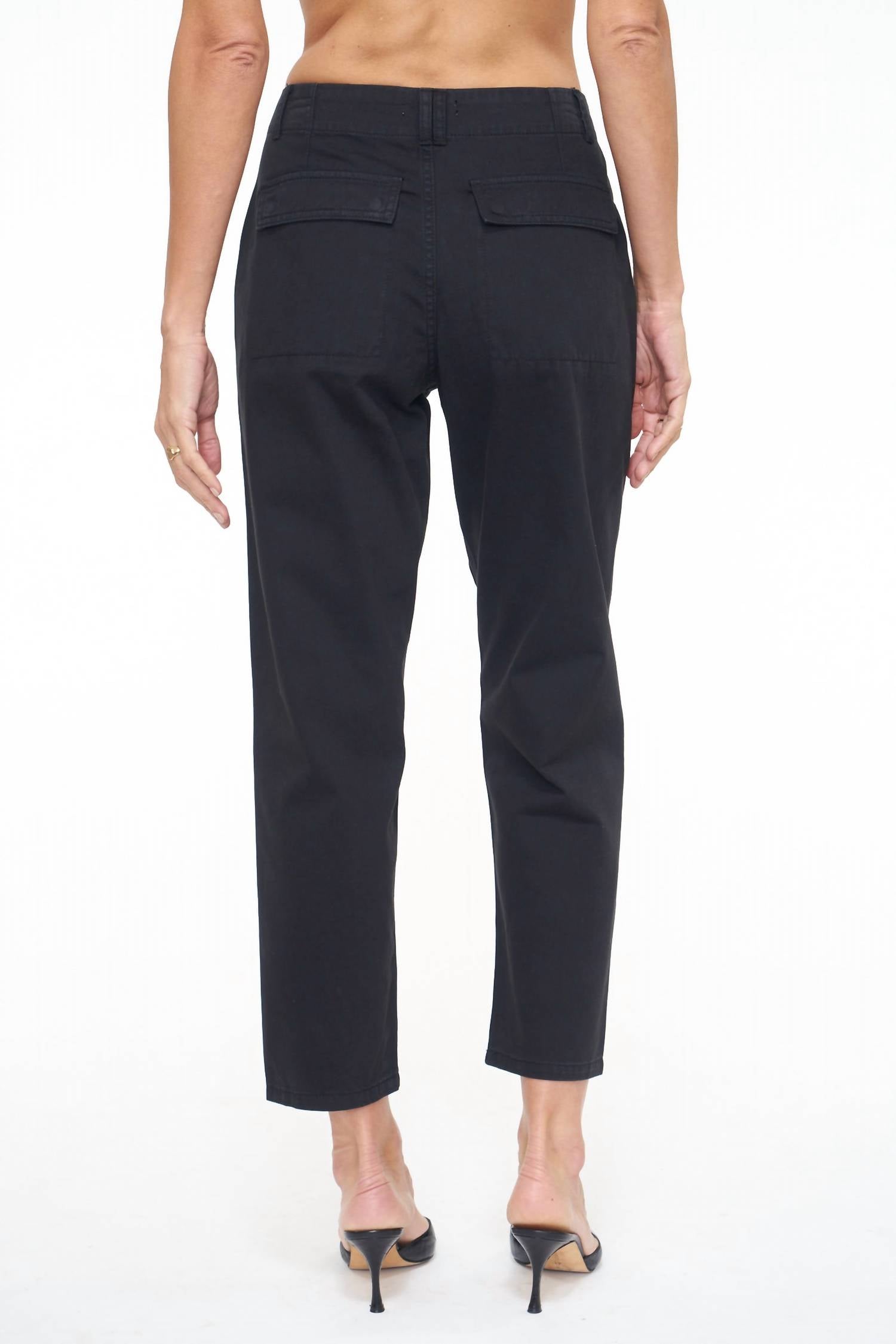Zip fly with hook and bar closure. Side slip pockets. Back flap pockets. Relaxed ankle length, straight leg trouser. 41 cm at the knee narrows to 30 cm at the leg opening. 100% cotton. Made in China. Machine wash.