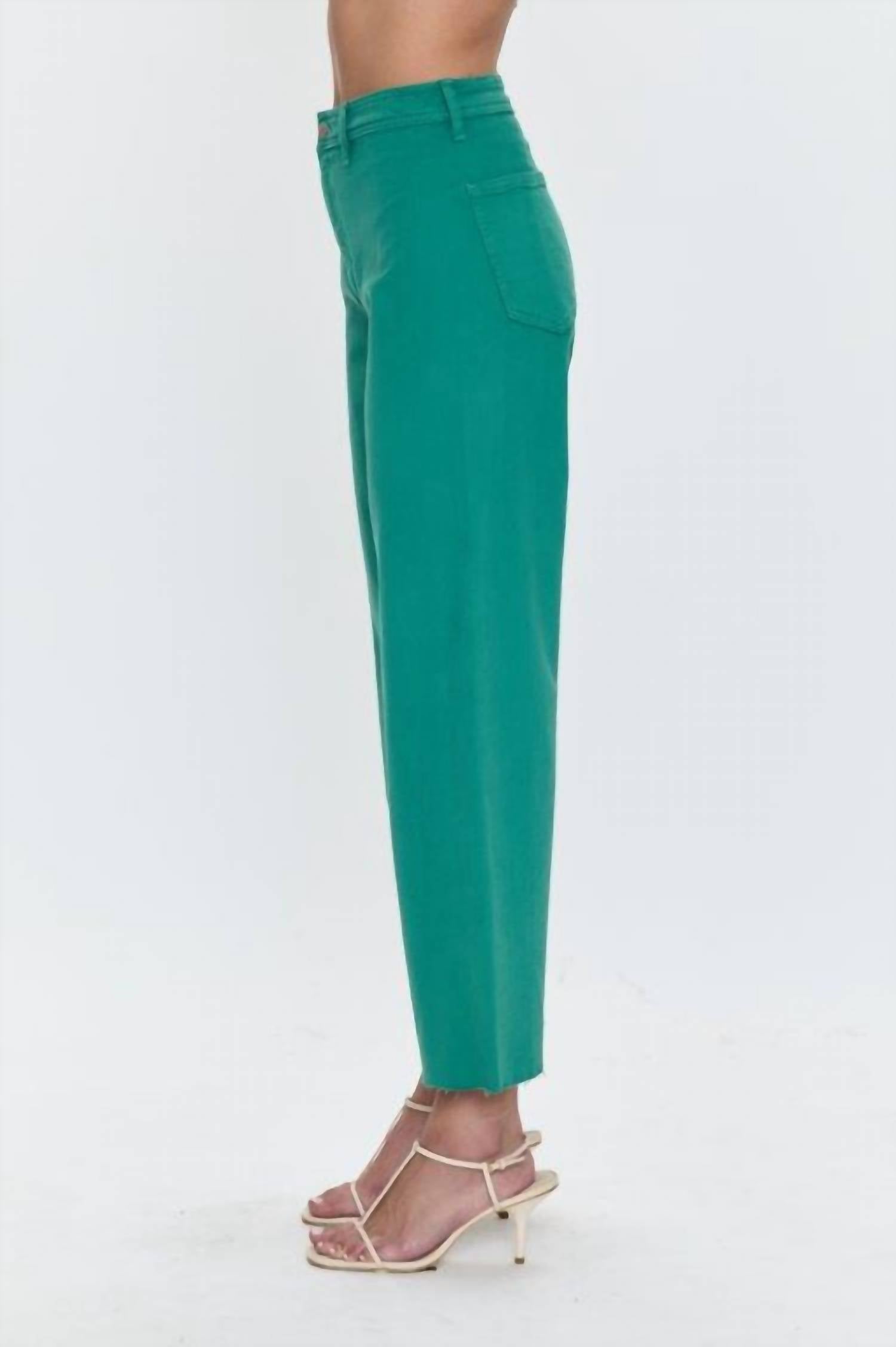 Introducing the Penny Crop Pant by PISTOLA, a chic choice for modern wardrobes. Flaunting a high-rise waist and a wide-leg silhouette, this piece comes in a vibrant Viridian color for a bold style statement. Crafted from a cotton blend with 99% cotton and 1% elastane, it features a button closure and scissor-cut hems for a relaxed fit. With a rise of 12 inches, an inseam of 27 inches, and a leg opening of 21 inches, this pant is tailored for comfort and versatility. Please note: Do not wash. Perfect for summery outings or as a Mother's Day gift, this pant blends trendy maximalist design with functional elegance.