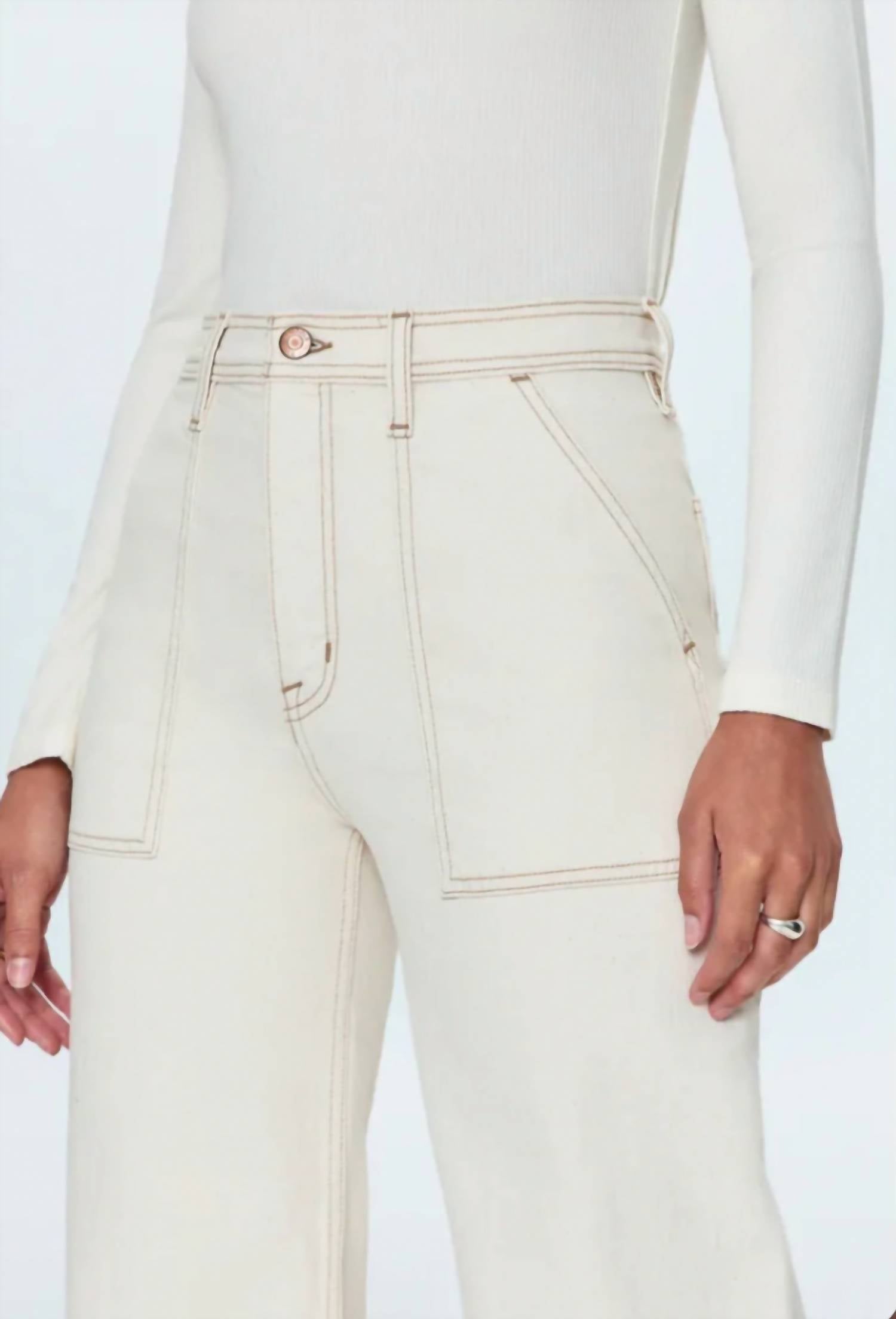 High rise waist, with a wide leg silhouette, front patch pockets and a full length 32" hemline. Crafted from their signature comfort stretch denim, with a double stitched waistline and stitched cuff hem finish. Ecru is a warm, off-white colored denim defined by contrasting brown stitching throughout and finished with copper hardware details.