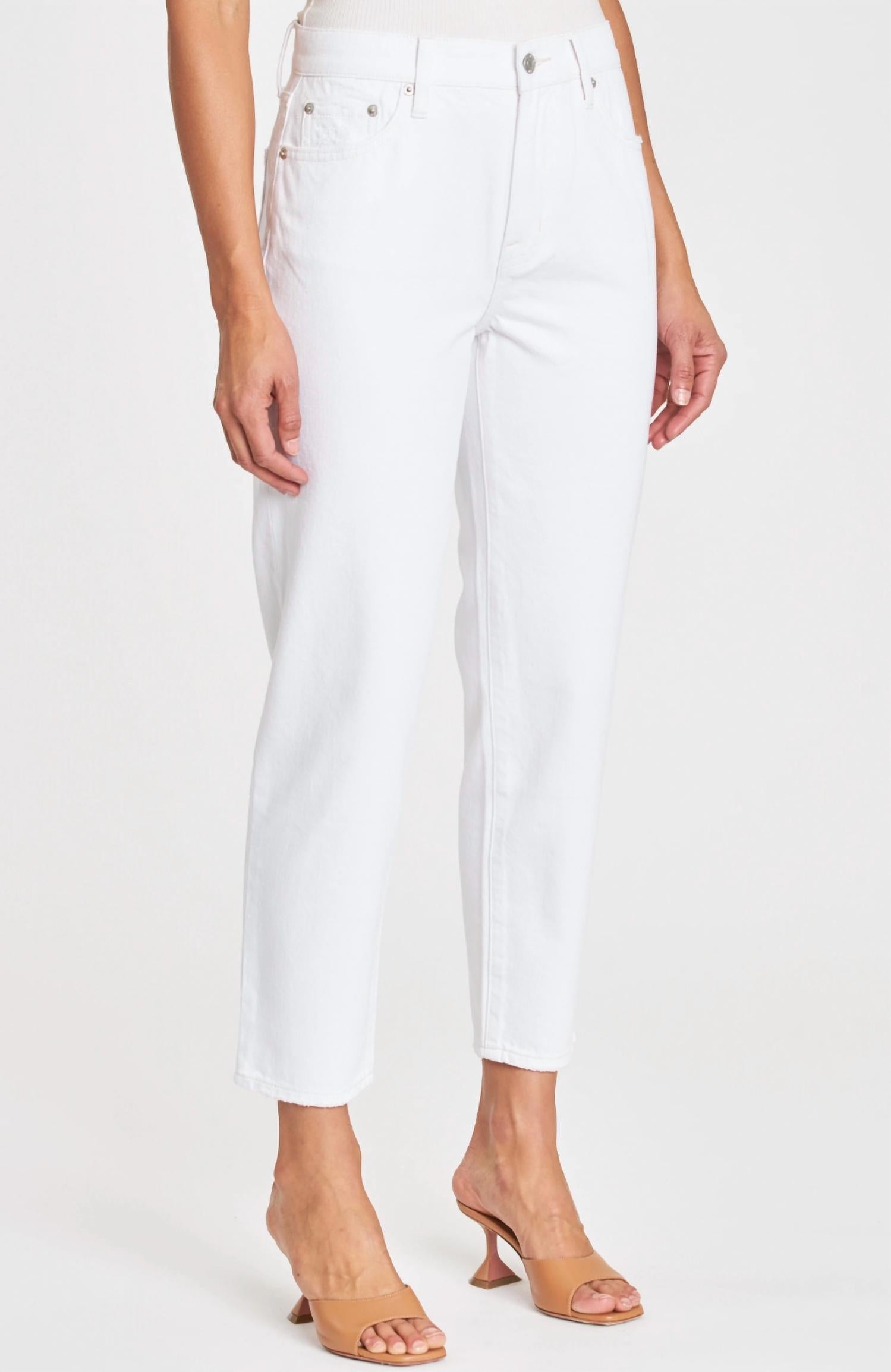75% Cotton / 25% Rayon. The Presley is a high-rise vintage '90s jean, now in a cropped length. Relaxed, looser fit. This style in the Snowstorm wash features a clean white wash and no distressing. True to size. Wash cold