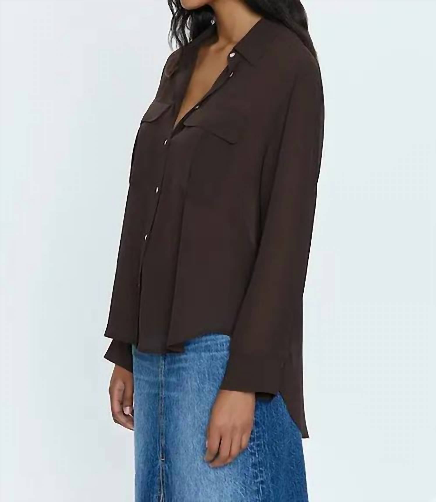 This button down shirt is comfortable yet polished. Elevate your wardrobe with the Reese Sheer Button Down Shirt by PISTOLA, perfect for a minimalist holiday party look. This lightweight and semi-sheer top in the rich Dark Roast color features long, cuffed sleeves and a collared neckline, complemented by practical front flap pockets. Made from 100% Polyester, its design is finished with a stylish high-low hem and a convenient button closure. Ideal for spring and Thanksgiving occasions, this solid pattern shirt adds a touch of elegance to any ensemble.