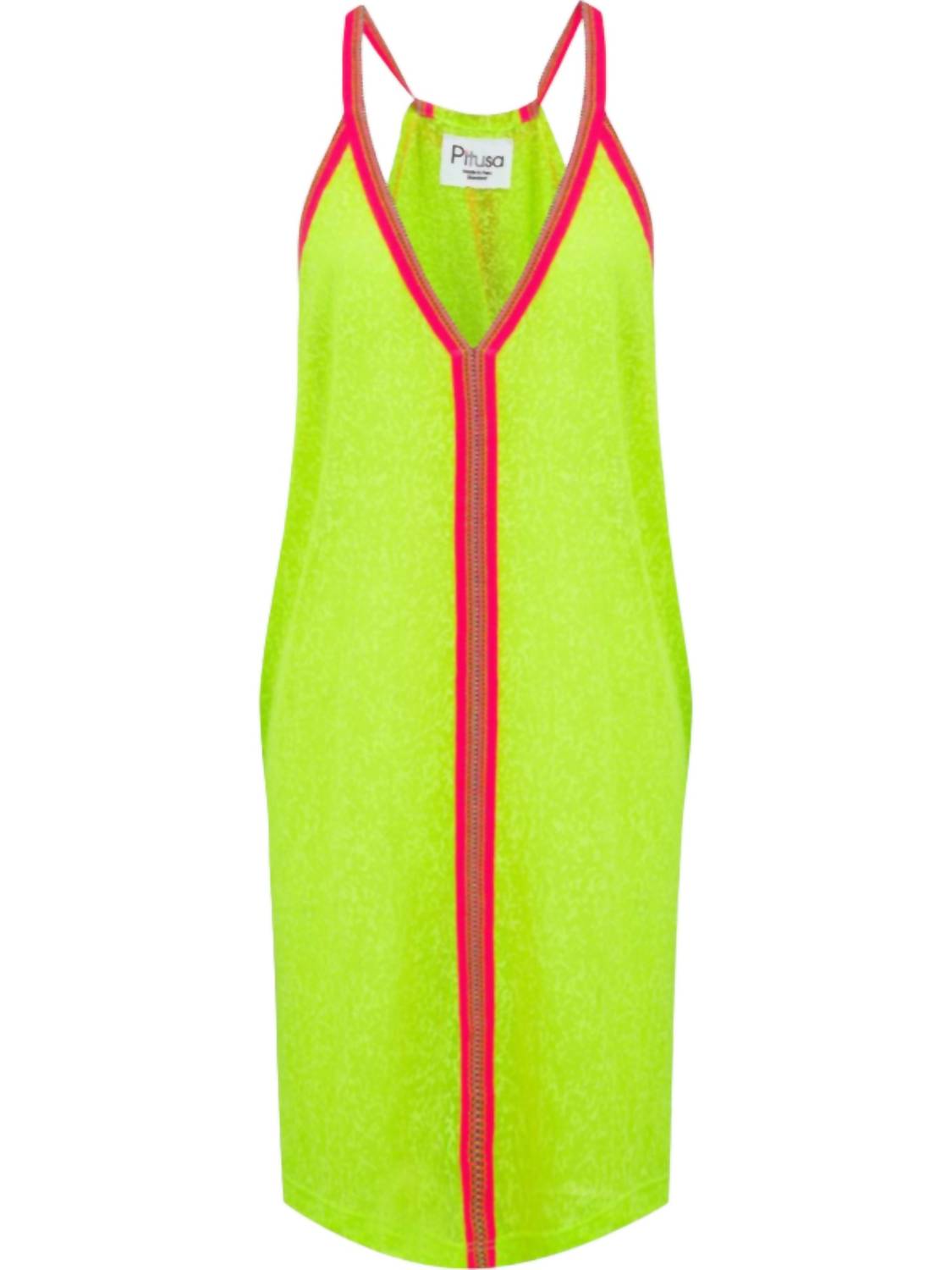 The kind of easy and flattering dress you'll be reaching for all season long.Refreshing Lemon hue. Lightweight, sleeveless dress. Beautifully highlights your figure. Shift silhouette and flirty V-neckline. Crafted from a luxurious blend of 50% Viscose and 50% Polyester. Sheer burnout fabric. Made with care in Peru. Easy to care for with a simple pull-on closure and machine washability.