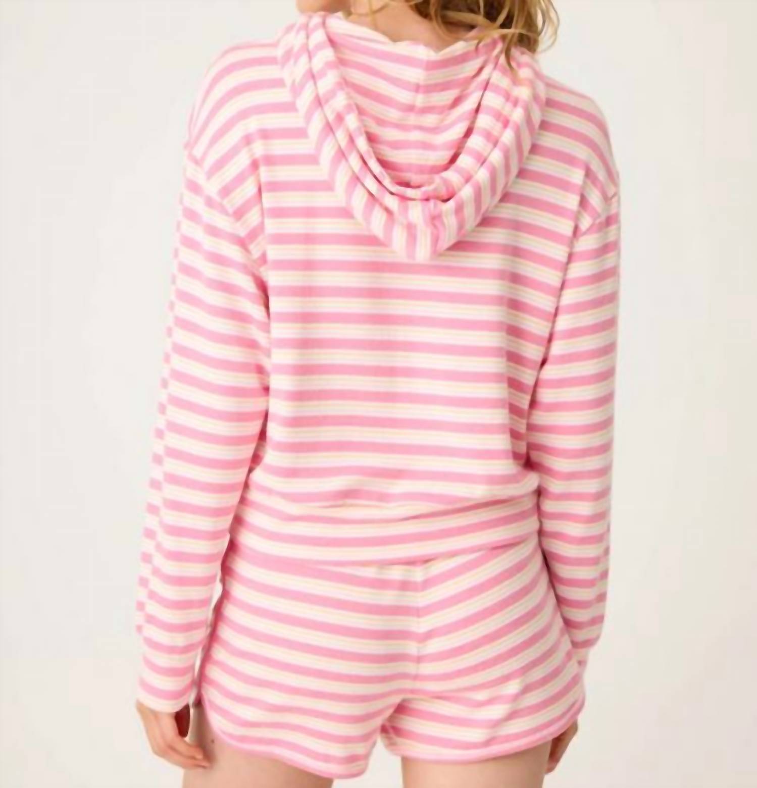 Introducing the PJ Salvage Tini Time Hoodie, a cozy addition to your fall wardrobe in a delightful Sorbet shade. This minimalist hooded sweatshirt features long sleeves and is crafted from a peachy jersey blend of 81% Polyester, 14% Rayon, and 5% Elastane. With a pull-on closure and no pockets, it's designed for streamlined comfort and style. Easy to care for, just turn the garment inside out and machine wash cold.