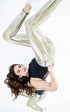 Step into elegance with the High Rise Legging by Playground, crafted in an iridescent soft gold hue for a standout style. These leggings offer a high-rise fit with a high band and feature a skinny leg style in a solid pattern. Made from 83% polyester and 17% spandex, they boast four-way stretch and moisture-wicking properties, enhanced by a triangle gusset.