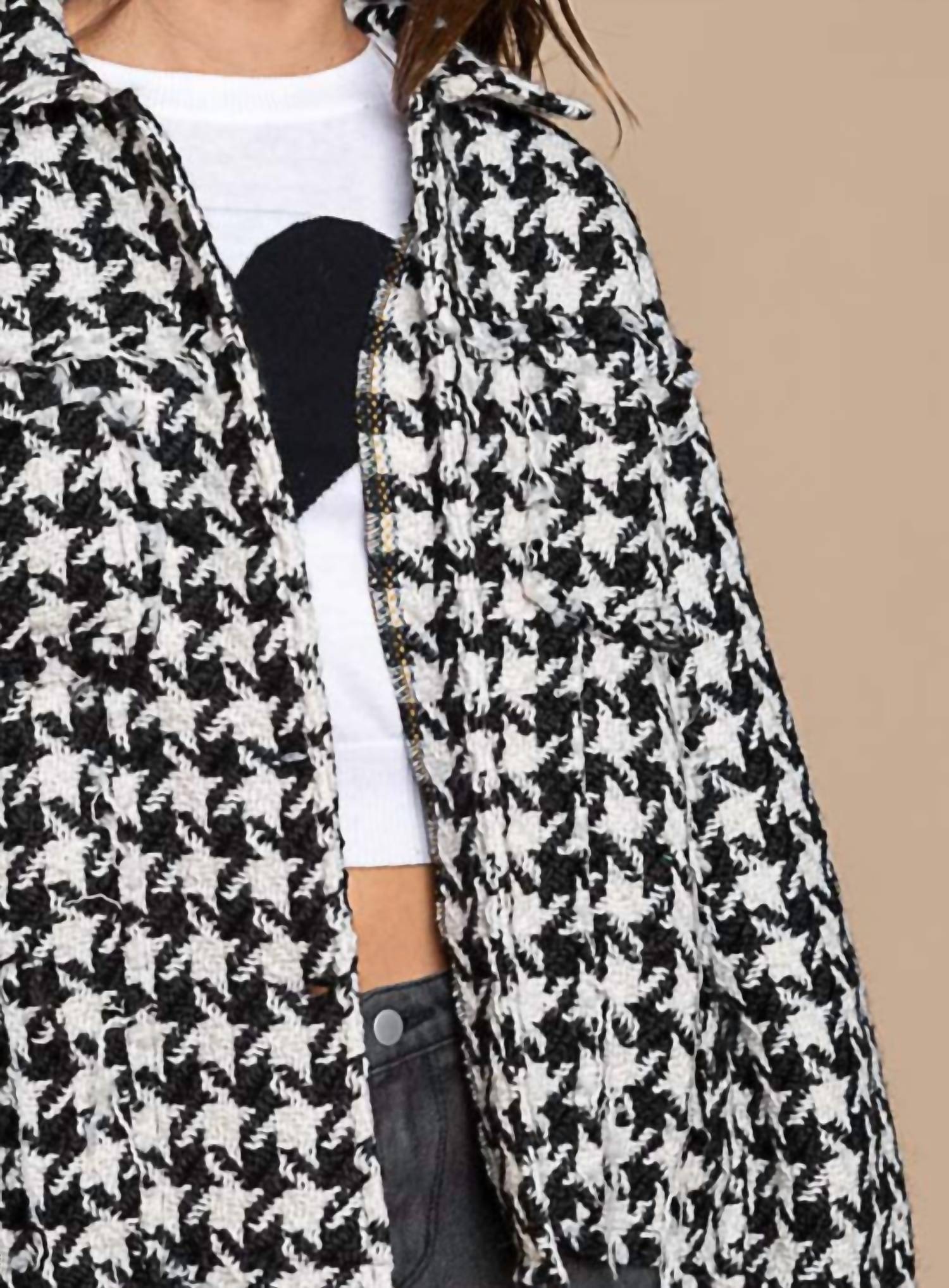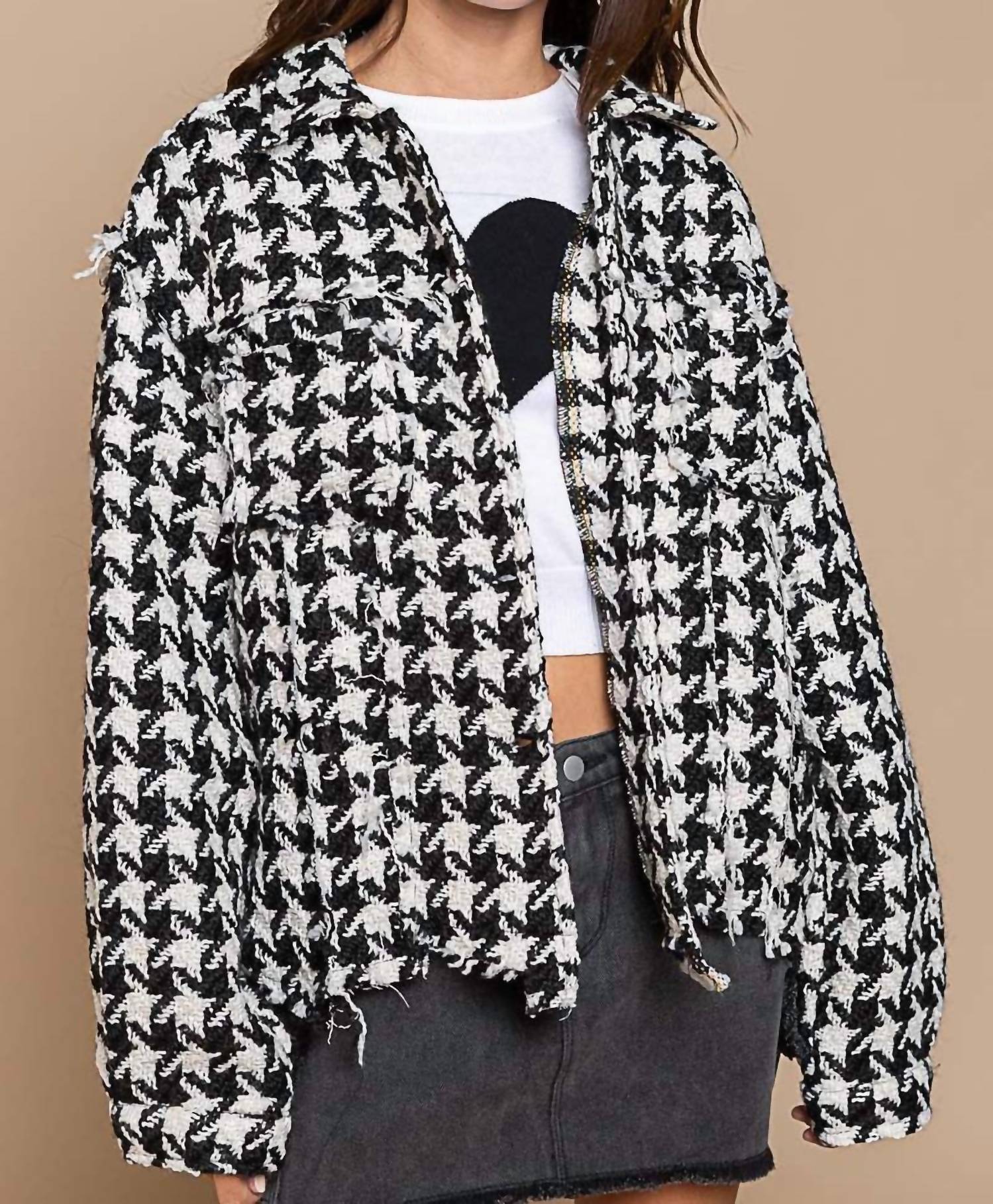 A riff on your favorite classic bomber jacket. Elevate your outerwear with the POL Houndstooth Tweed Jacket, a chic bomber in timeless black. This piece flaunts long sleeves and a classic collar, crafted from polyester for a comfortable, stylish fit. Dimensions include a 23" length from the top of the shoulder to hem and a 26.5" width from armpit to armpit, accommodating sizes up to XL. Closure: Button closure. Care: Machine washable for easy maintenance.
