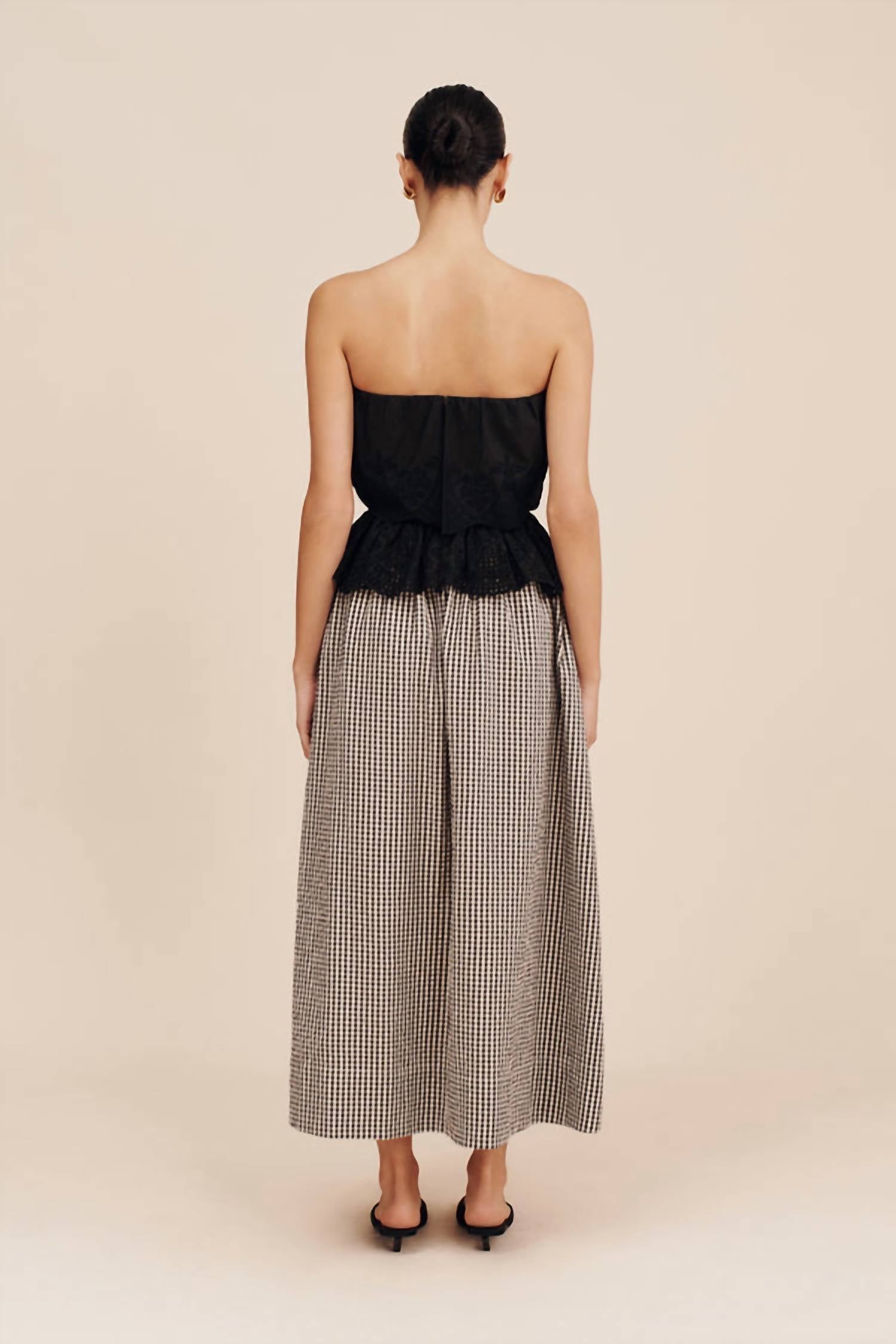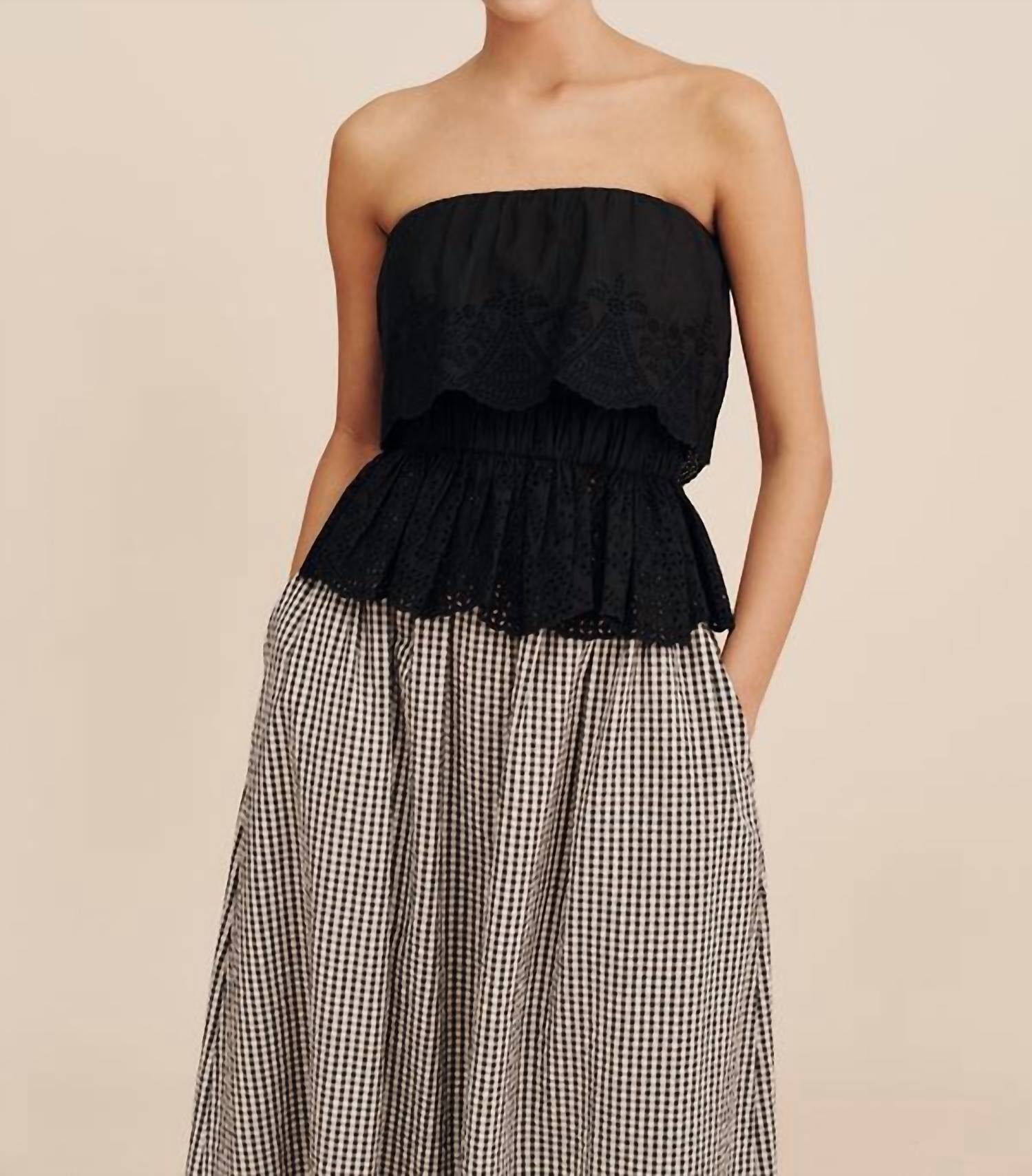 Introducing the Beryl Strapless Top by POSSE, a chic addition for your evening events or New Year's Eve celebrations. Expertly crafted from 100% BCI Certified Cotton, this top features a strapless design with intricate vintage-inspired embroidery. The peplum hem and ruffled waist create a flattering silhouette, complete with a firm fitting elastic waistband. Closure: Pull on. This trendy piece is perfect for capturing the essence of 90s fashion.