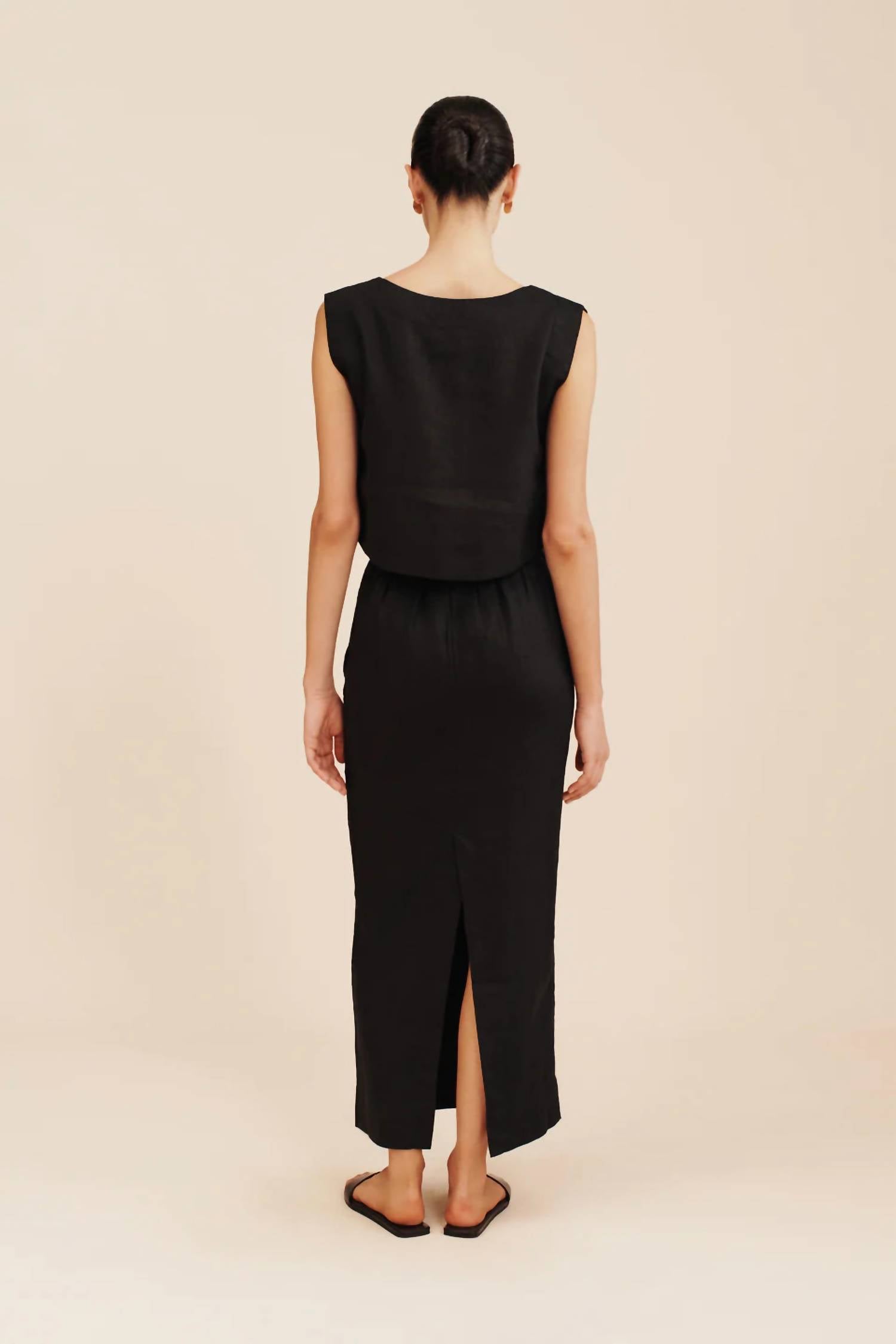 Fit flattering, sexy and comfortable. This pencil skirt has it all. Elevate your wardrobe with the Emma Pencil Skirt by POSSE, a chic addition perfect for any summer event. Crafted from 100% Linen, this high-waisted black skirt features an elegant maxi hem and a back split for easy movement. Its design, complete with a comfortable wide waistband with an elastic back and a side zipper, ensures a flattering fit. Made in India, this lined skirt is best maintained with a hand wash.