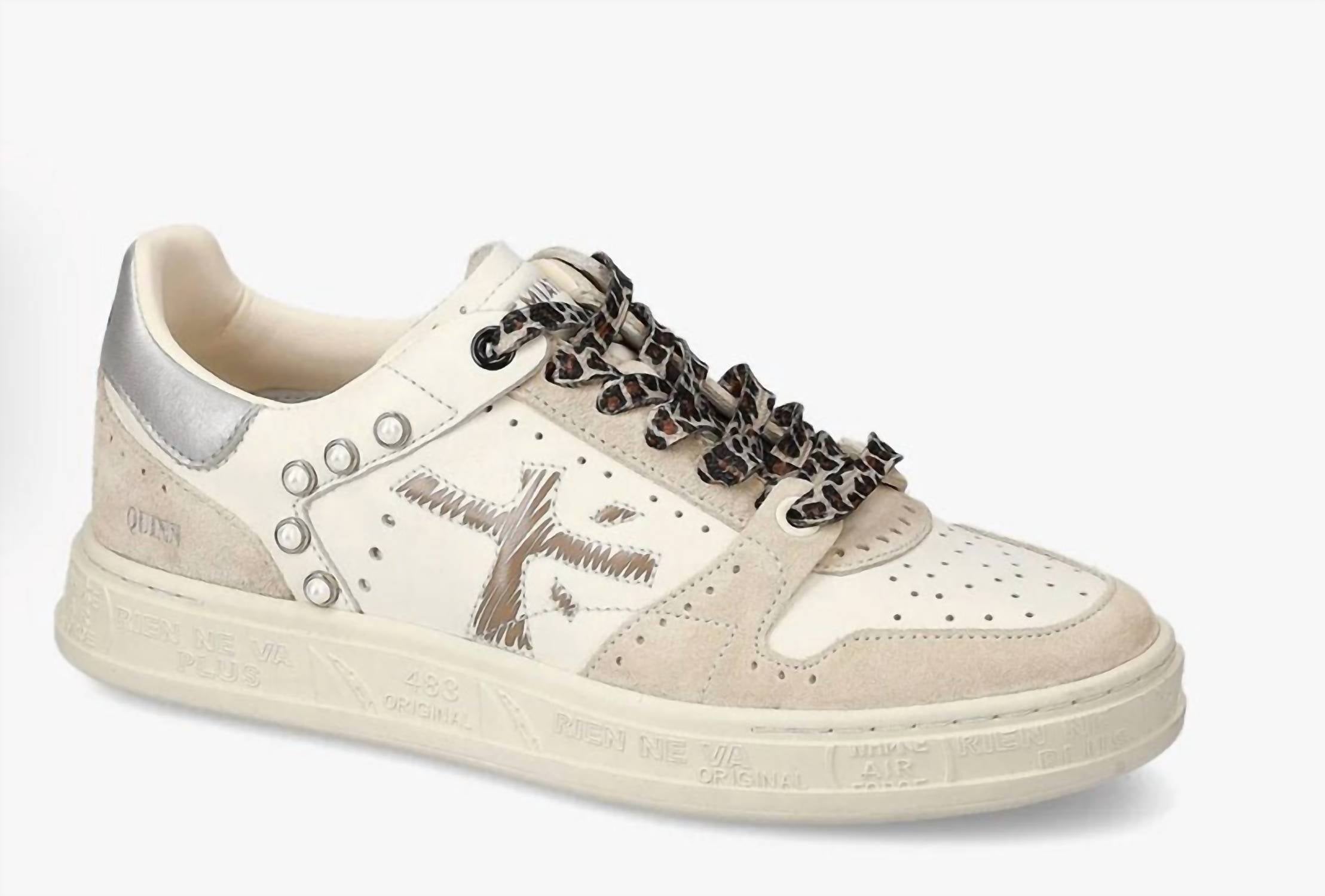 When fashion and function come together seamlessly. The Quinnd Var 6960 Sneakers by PREMIATA are a luxurious reinterpretation of sports footwear, crafted in a sophisticated white and lavishly detailed with Brogue-inspired perforations. These women's sneakers stand on a comfortable flat heel with a sole height of 3 cm and are designed for an adult audience. Crafted with a composition of 90% calf leather and 10% sheepskin for the upper, they feature a lining made of 86% goat leather and 14% PU, and a durable 100% rubber sole. With a round toe shape and style rooted in classic elegance, these sneakers embody a seamless blend of couture and sport.