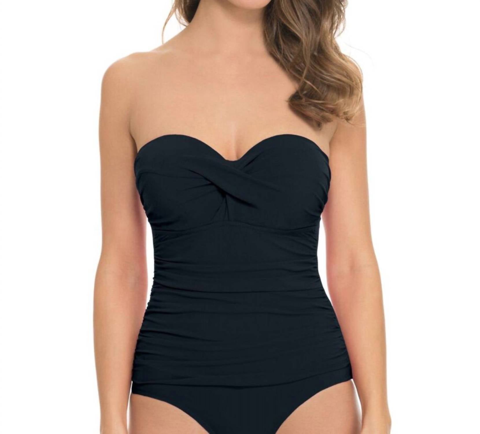 Discover the Bandeau Underwire D-cup One Piece Swimsuit by Profile By Gottex in vibrant Tutti Frutti Black, crafted from 72% polyamide and 28% elastane for a sleek silhouette. This one-piece features adjustable slide shoulder straps and an underwire bra with soft molded cups, offering a personalized fit and enhanced bust support. The empire waist and shirred bodice visually slim the torso, while the powernet tummy control smooths and slims the waist for a flattering look. Care instructions are not provided for this full-coverage solid swimsuit.
