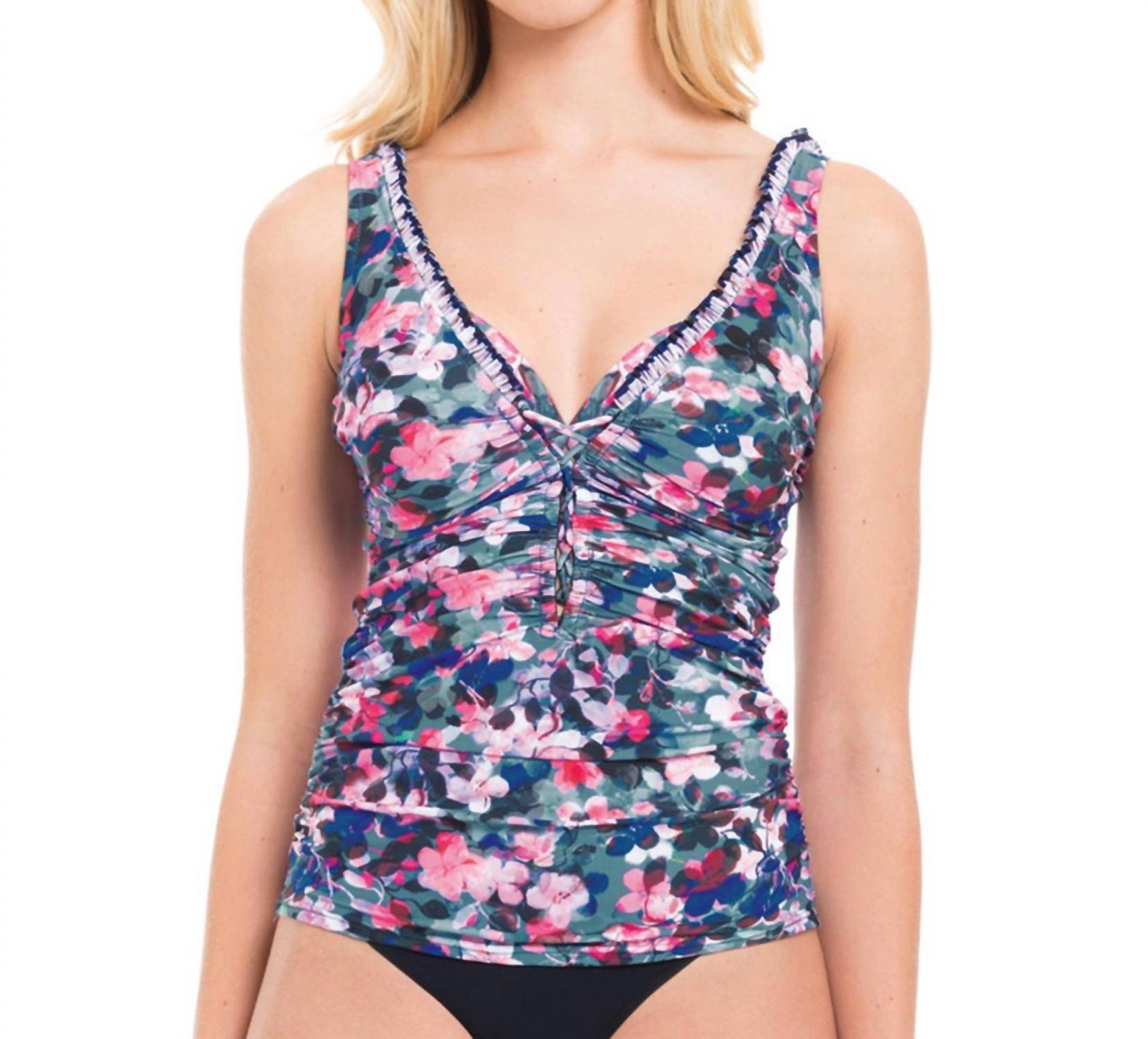 This cute and flattering swimsuit is perfect for making a splash at the pool, lounging on sun-kissed beaches, and staying stylish throughout the upcoming summer season. This Tankini Top accentuate bust with ruffle v-neckline. Visually slim torso with shirred bodice. Adjustable straps lend personalized fit. Underwire molded d-cup bra. 72% polyamide, 28% elastane. Model measurements: height: 71in bust: 33in waist: 25in hip: 36in model wears: us size 4.