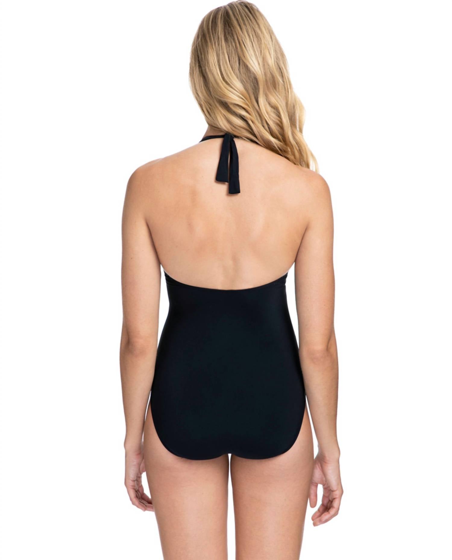 This one piece fits like a glove and covers all the right areas. The Deep V-neck One Piece Swimsuit by Profile By Gottex offers a striking silhouette with its backless, sleeveless design and halter ties. Crafted from 80% Polyamide and 20% Elastane, this solid-colored swimsuit features a knot and tape detail along with a wireless bra and removable padding for customizable comfort. It can be styled in two ways thanks to its versatile straps that end with hooks.