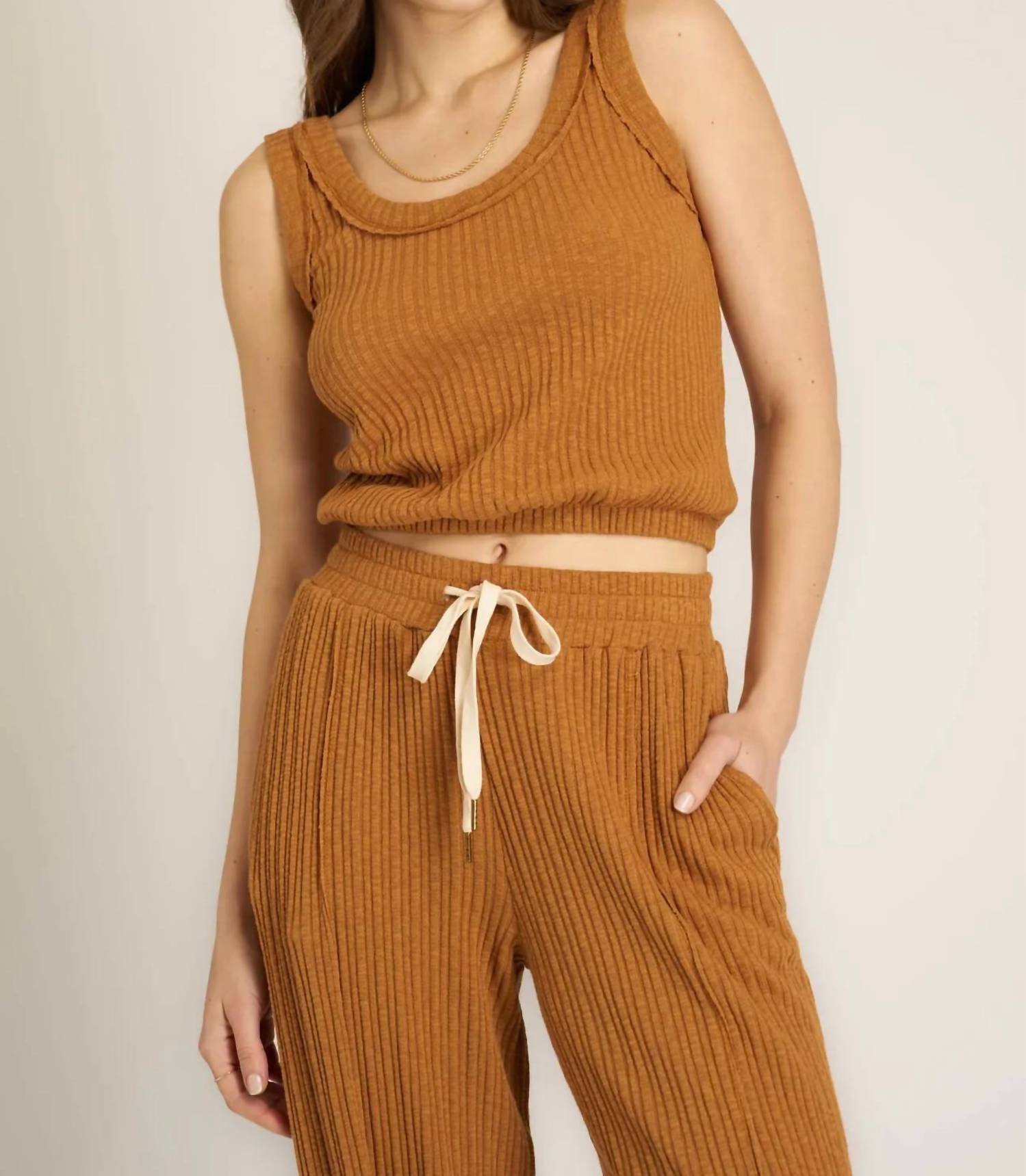 Fit, fabric and functionality. This tank top checks all the boxes. Embrace effortless style in Saddle. Featuring a relaxed fit and textured rib fabric. Sleeveless design boasts a scoop neckline, raw edges, and a banded hemline for a chic yet comfortable look. Composed of 95% Cotton, 5% Spandex. Pull on closure. Machine wash cold inside out with similar colors, lay flat to dry, cool iron if needed.