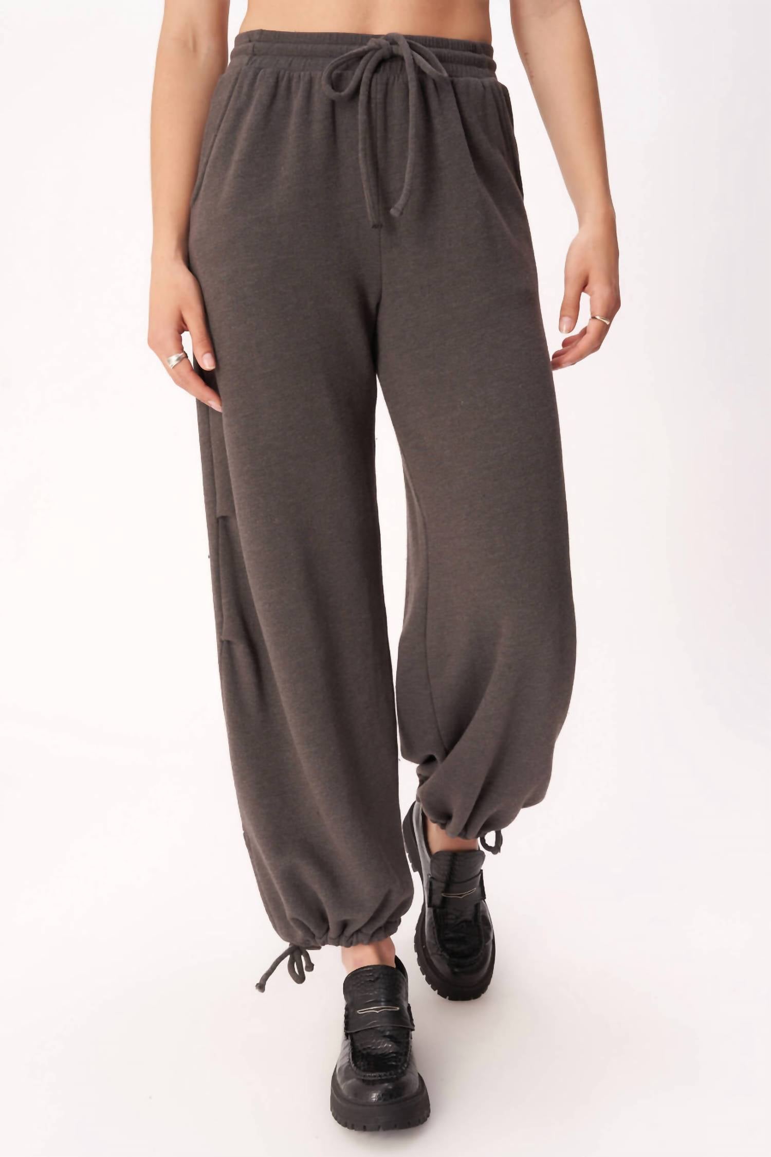 No gym necessary for these cool-girl joggers. Relaxed fit. Parachute silhouette. Elasticized waistband with adjustable drawstring. Side pockets. Adjustable tie cuff. Medium-weight French terry fabrication. Vitoria is wearing a size Extra Small. 69% Cotton, 31% Polyester. Machine wash cold. Wash inside out with similar colors. Do not bleach. Lay flat to dry. Cool iron if needed. Measurements (taken from size S): Waist: 13.75", Front rise: 12", Back rise: 15.5", Inseam: 30.5".